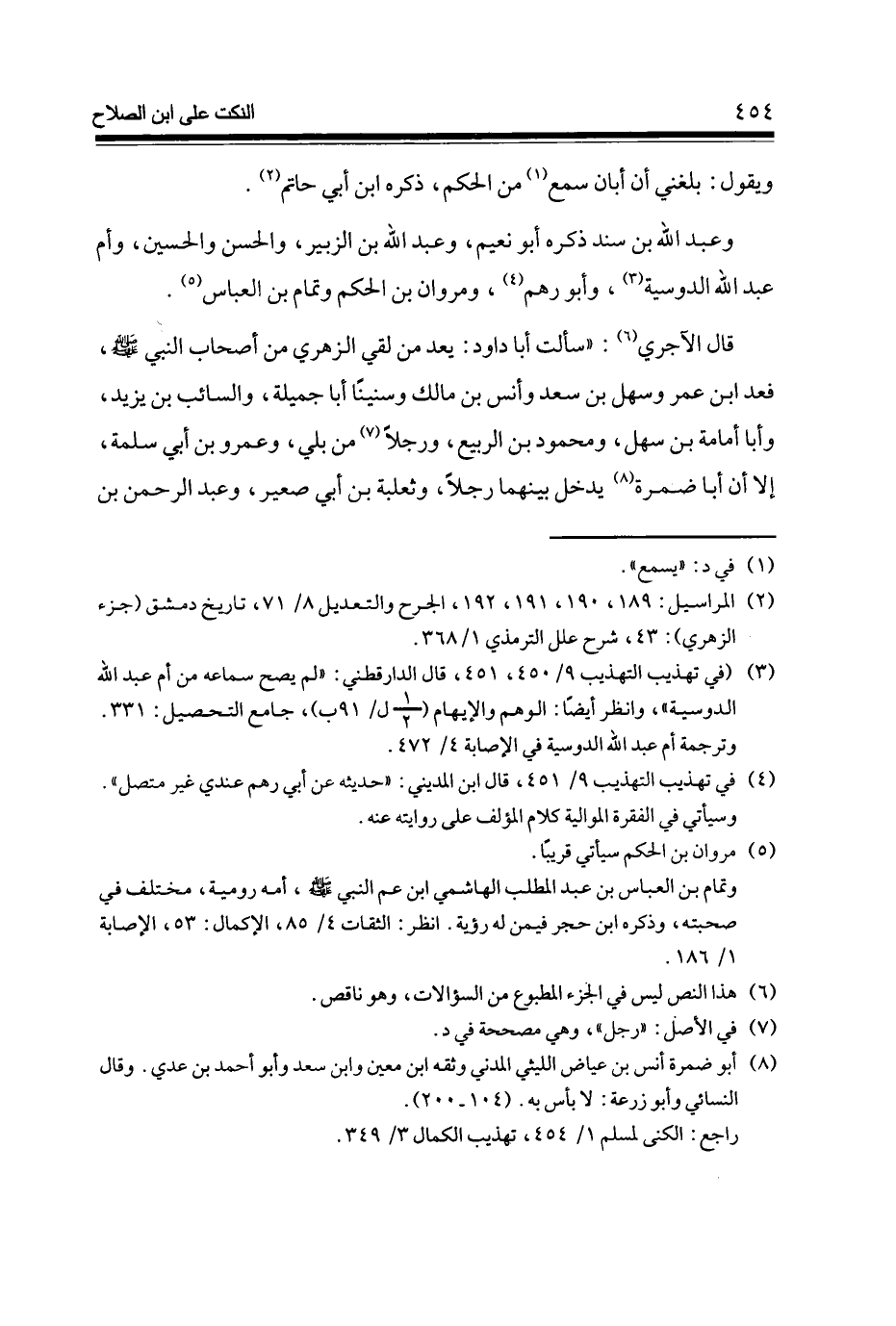 قَالَ الْآجُرِيّ سَأَلت أَبَا دَاوُد يعد من لَقِي الزُّهْرِيّ من أَصْحَاب النَّبِي صلى الله عَلَيْهِ وَسلم فعد ابْن عمر وَسَهل بن سعد وَأنس بن مَالك وسنينا أَبَا جميلَة والسائب بن يزِيد وَأَبا أُمَامَة بن سهل ومحمود بن الرّبيع ورجلا من بلي وَعَمْرو بن أبي سَلمَة إِلَّا أَن أَبَا ضَمرَة يدْخل بَينهمَا رجلا وثعلبة بن أبي صعير وَعبد الرَّحْمَن بن