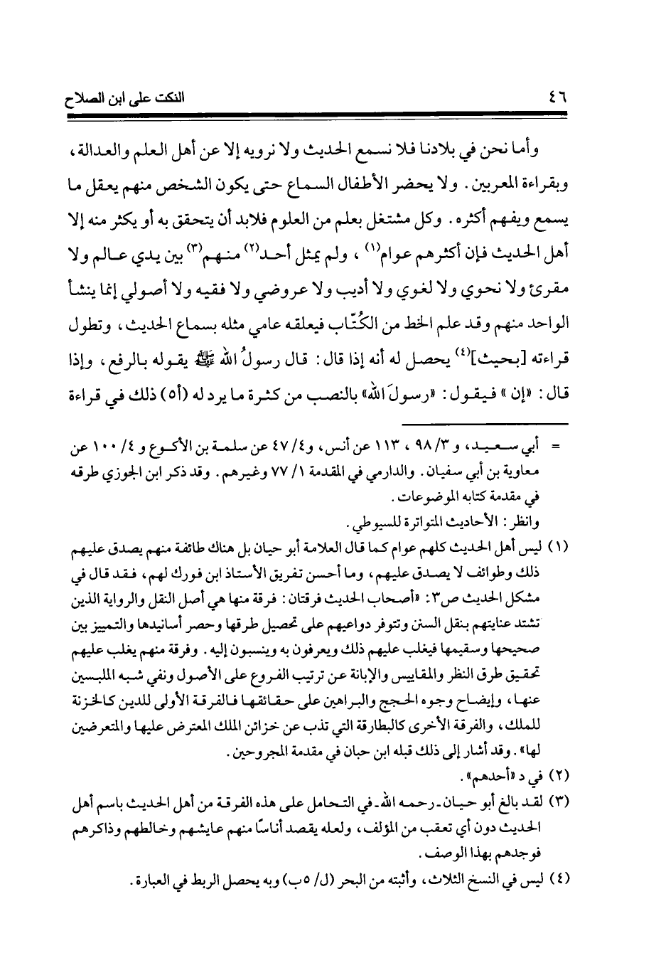 وَأما نَحن فِي بِلَادنَا فَلَا نسْمع الحَدِيث وَلَا نرويه إِلَّا عَن أهل الْعلم وَالْعَدَالَة وبقراءة المعربين وَلَا يحضر الْأَطْفَال السماع حَتَّى يكون الشَّخْص مِنْهُم يعقل مَا يسمع وَيفهم أَكْثَره وكل مشتغل بِعلم من الْعُلُوم فَلَا بُد أَن يتَحَقَّق بِهِ أَو يكثر مِنْهُ إِلَّا أهل الحَدِيث فَإِن أَكْثَرهم عوام وَلم يمثل أحد مِنْهُم بَين يَدي عَالم وَلَا مقرئ وَلَا نحوي وَلَا لغَوِيّ وَلَا أديب وَلَا عروضي وَلَا فَقِيه وَلَا أصولي إِنَّمَا ينشأ الْوَاحِد مِنْهُم وَقد علم الْخط من الْكتاب فيعلقه عَامي مثله بِسَمَاع الحَدِيث وتطول قِرَاءَته [بِحَيْثُ] يحصل لَهُ أَنه إِذا قَالَ قَالَ رَسُول الله صلى الله عَلَيْهِ وَسلم يَقُوله بِالرَّفْع وَإِذا قَالَ إِن فَيَقُول رَسُول الله بِالنّصب من كَثْرَة مَا يرد لَهُ (أ 5) ذَلِك فِي قِرَاءَة