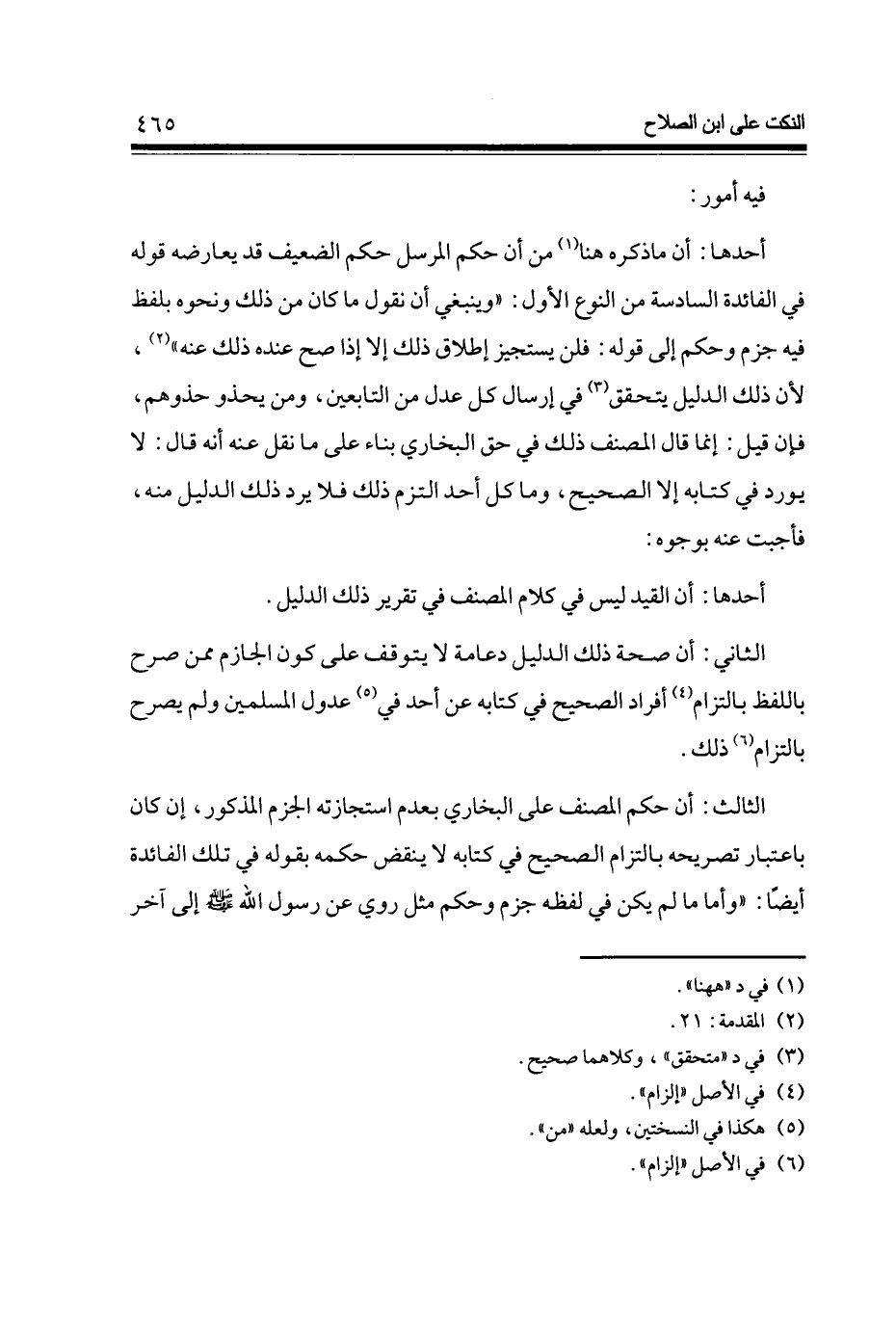 أَحدهَا أَن مَا ذكره هُنَا من أَن حكم الْمُرْسل حكم الضَّعِيف قد يُعَارضهُ قَوْله فِي الْفَائِدَة السَّادِسَة من النَّوْع الأول وَيَنْبَغِي أَن نقُول مَا كَانَ من ذَلِك وَنَحْوه بِلَفْظ فِيهِ جزم وَحكم إِلَى قَوْله فَلَنْ يستجيز إِطْلَاق ذَلِك إِلَّا إِذا صَحَّ عِنْده ذَلِك عَنهُ لِأَن ذَلِك الدَّلِيل يتَحَقَّق فِي إرْسَال كل عدل من التَّابِعين وَمن يحذو حذوهم فَإِن قيل إِنَّمَا قَالَ المُصَنّف ذَلِك فِي حق البُخَارِيّ بِنَاء على مَا نقل عَنهُ أَنه قَالَ لَا يُورد فِي كِتَابه إِلَّا الصَّحِيح وَمَا كل أحد الْتزم ذَلِك فَلَا يرد ذَلِك الدَّلِيل مِنْهُ فأجبت عَنهُ بِوُجُوه