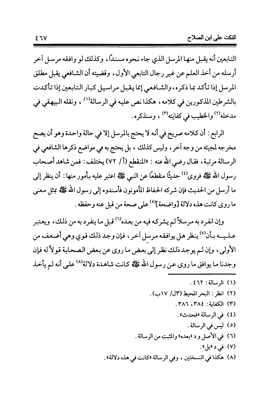 التَّابِعين أَنه يقبل مِنْهَا الْمُرْسل الَّذِي جَاءَ نَحوه مُسْند وَكَذَلِكَ لَو وَافقه مُرْسل آخر أرْسلهُ من أَخذ الْعلم عَن غير رجال التَّابِعِيّ الأول وَقَضيته أَن الشَّافِعِي يقبل مُطلق الْمُرْسل إِذا تَأَكد بِمَا ذكره وَالشَّافِعِيّ إِنَّمَا يقبل مَرَاسِيل كبار التَّابِعين إِذا تأكدت بالشرطين الْمَذْكُورين فِي كَلَامه هَكَذَا نَص عَلَيْهِ فِي الرسَالَة وَنَقله الْبَيْهَقِيّ فِي مدخله والخطيب فِي كِفَايَته وسنذكره