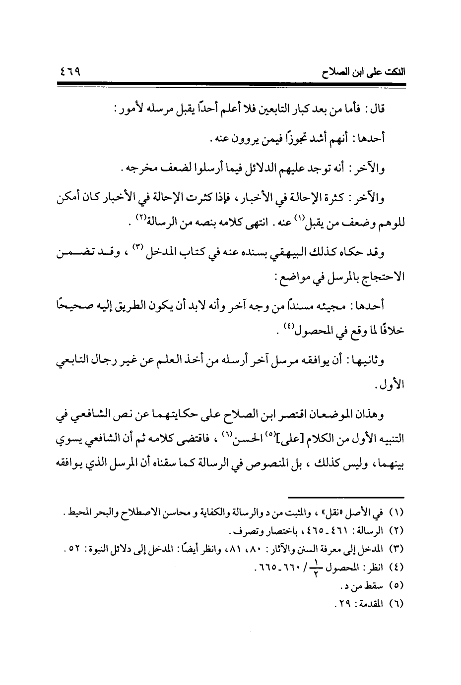 وَهَذَانِ الموضعان اقْتصر ابْن الصّلاح على حكايتهما عَن نَص الشَّافِعِي فِي التَّنْبِيه الأول من الْكَلَام [على] الْحسن فَاقْتضى كَلَامه ثمَّ أَن الشَّافِعِي يُسَوِّي بَينهمَا وَلَيْسَ كَذَلِك بل الْمَنْصُوص فِي الرسَالَة كَمَا سقناه أَن الْمُرْسل الَّذِي يُوَافقهُ