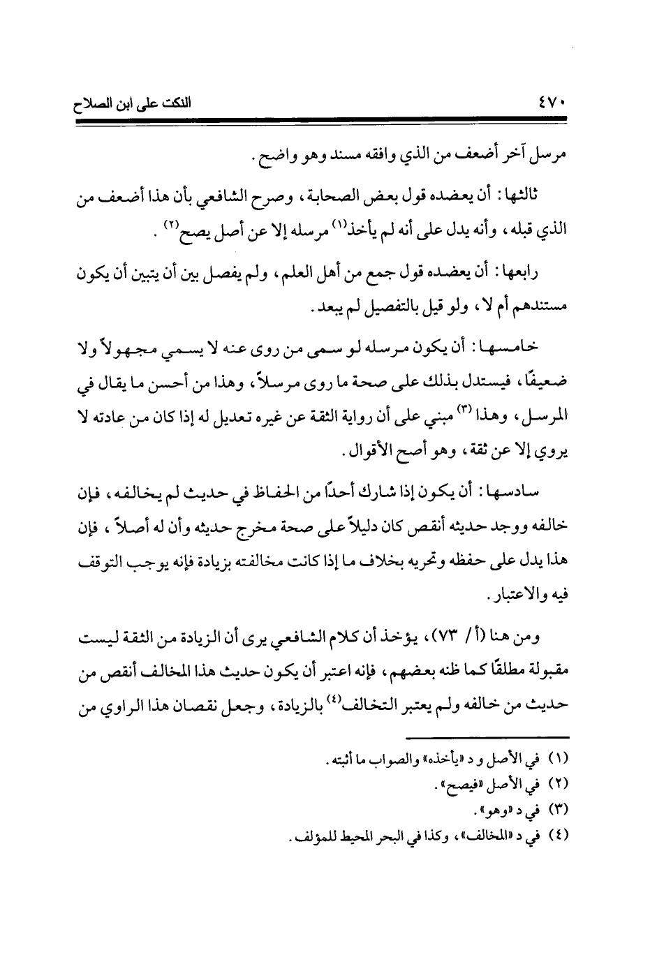 وَمن هُنَا (أ / 73) يُؤْخَذ أَن كَلَام الشَّافِعِي يرى أَن الزِّيَادَة من الثِّقَة لَيست مَقْبُولَة مُطلقًا كَمَا ظَنّه بَعضهم فَإِنَّهُ اعْتبر أَن يكون حَدِيث هَذَا الْمُخَالف أنقص من حَدِيث من خَالفه وَلم يعْتَبر التخالف بِالزِّيَادَةِ وَجعل نُقْصَان هَذَا الرَّاوِي من