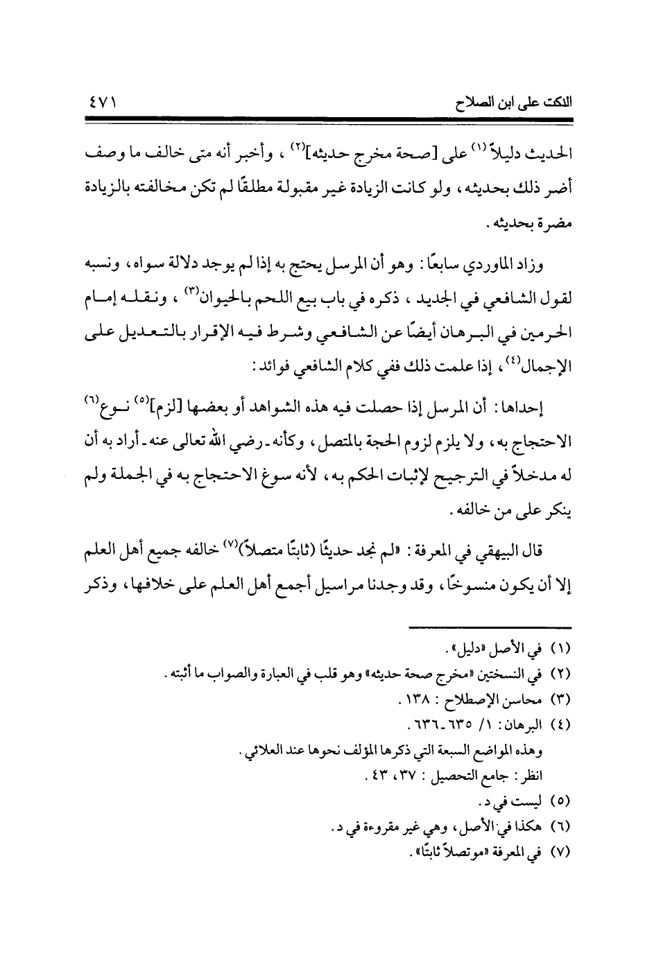 وَزَاد الْمَاوَرْدِيّ سابعا وَهُوَ أَن الْمُرْسل يحْتَج بِهِ إِذا لم يُوجد دلَالَة سواهُ وَنسبه لقَوْل الشَّافِعِي فِي الْجَدِيد ذكره فِي بَاب بيع اللَّحْم بِالْحَيَوَانِ وَنَقله إِمَام الْحَرَمَيْنِ فِي الْبُرْهَان أَيْضا عَن الشَّافِعِي وَشرط فِيهِ الْإِقْرَار بالتعديل على الْإِجْمَال إِذا علمت ذَلِك فَفِي كَلَام الشَّافِعِي فَوَائِد