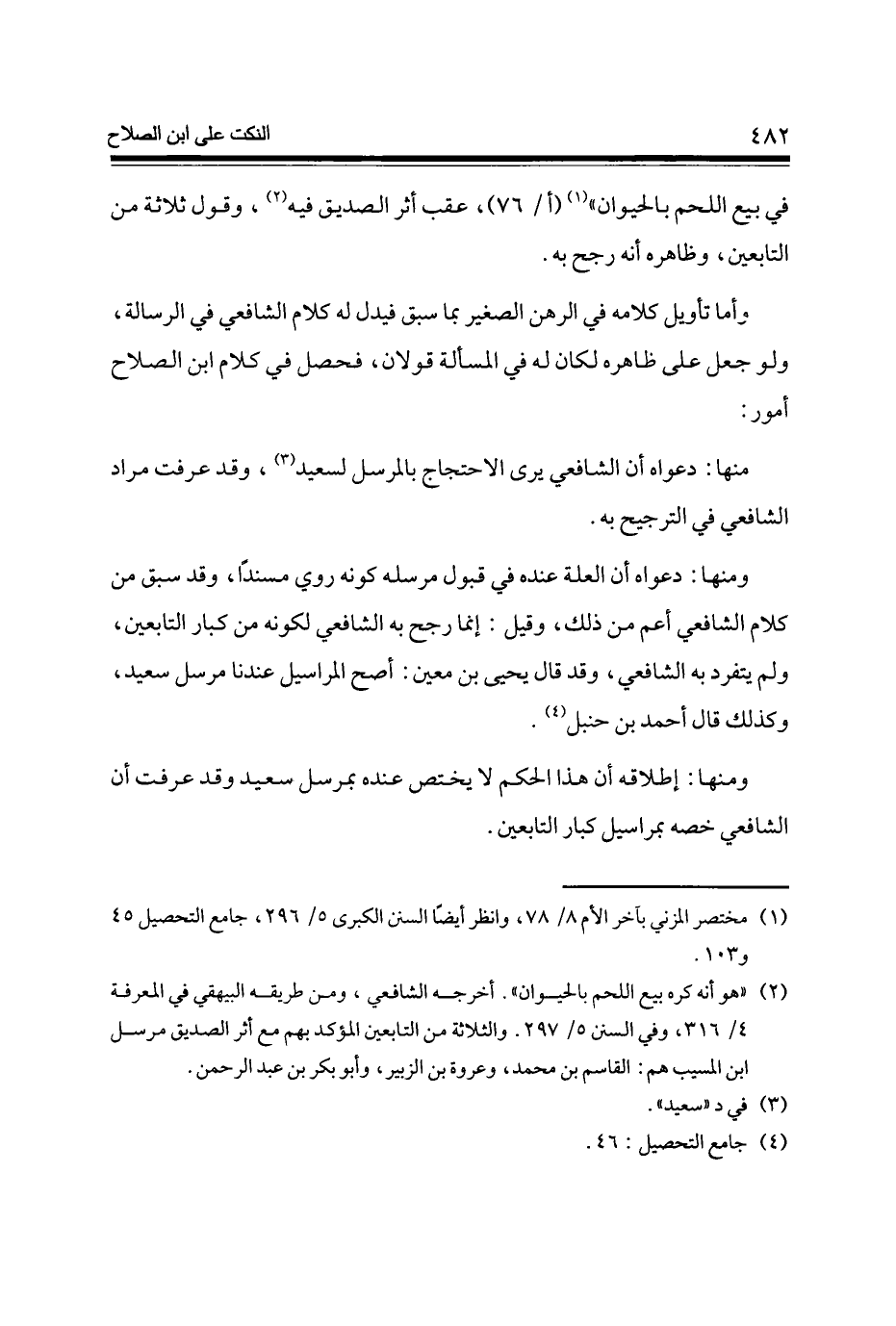 وَمِنْهَا دَعْوَاهُ أَن الْعلَّة عِنْده فِي قبُول مرسله كَونه رُوِيَ مُسْندًا وَقد سبق من كَلَام الشَّافِعِي أَعم من ذَلِك وَقيل إِنَّمَا رجح بِهِ الشَّافِعِي لكَونه من كبار التَّابِعين وَلم يتفرد بِهِ الشَّافِعِي وَقد قَالَ يحيى بن معِين أصح الْمَرَاسِيل عندنَا مُرْسل سعيد وَكَذَلِكَ قَالَ أَحْمد بن حَنْبَل