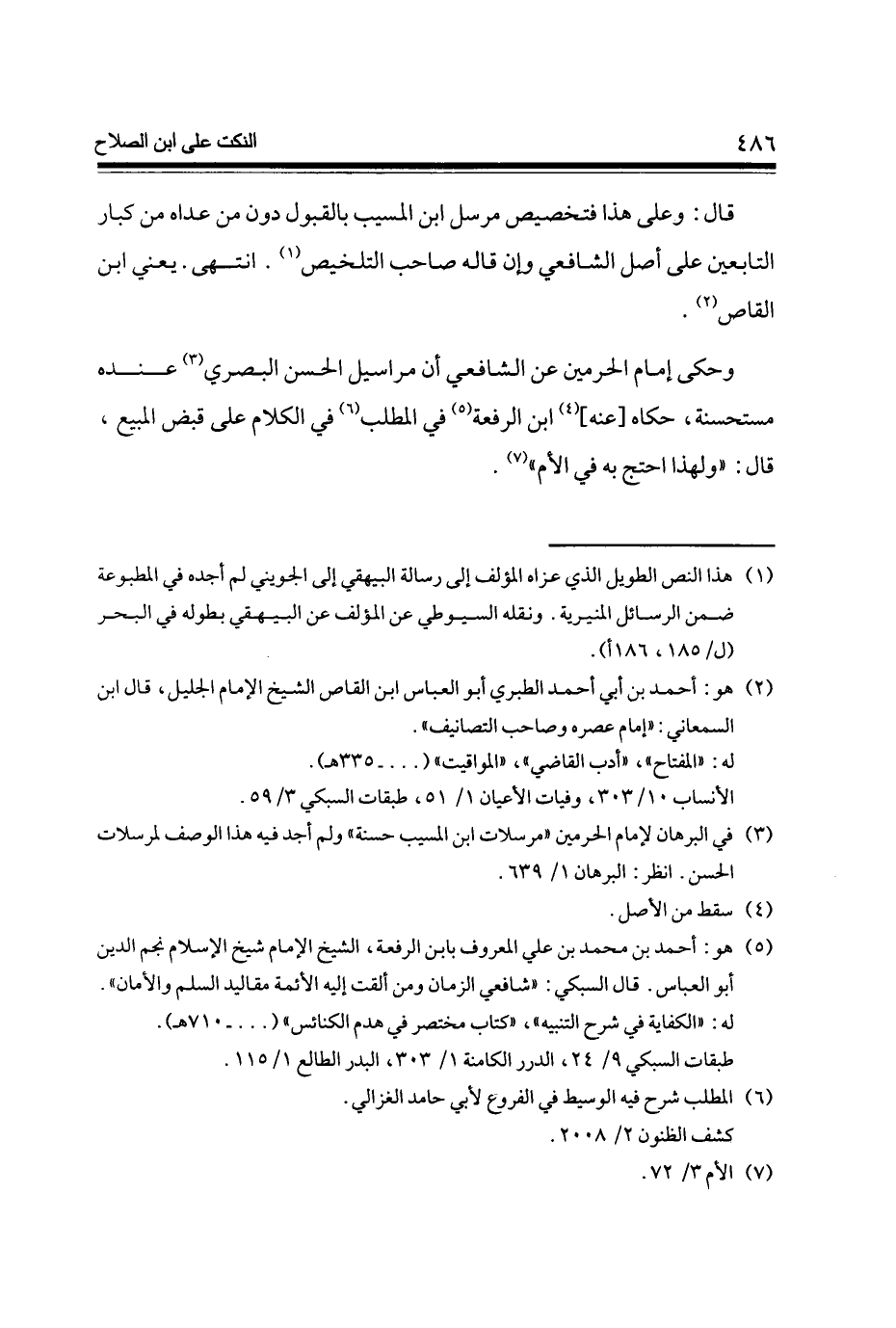 قَالَ وعَلى هَذَا فتخصيص مُرْسل ابْن الْمسيب بِالْقبُولِ دون من عداهُ من كبار التَّابِعين على أصل الشَّافِعِي وَإِن قَالَه صَاحب التَّلْخِيص انْتهى يَعْنِي ابْن الْقَاص
