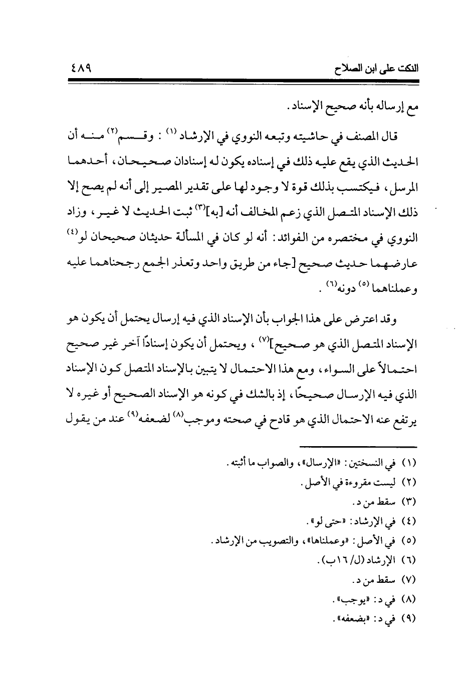 قَالَ المُصَنّف فِي حَاشِيَته وَتَبعهُ النَّوَوِيّ فِي الْإِرْشَاد وَقسم مِنْهُ أَن الحَدِيث الَّذِي يَقع عَلَيْهِ ذَلِك فِي إِسْنَاده يكون لَهُ إسنادان صَحِيحَانِ أَحدهمَا الْمُرْسل فيكتسب بذلك قُوَّة لَا وجود لَهَا على تَقْدِير الْمصير إِلَى أَنه لم يَصح إِلَّا ذَلِك الْإِسْنَاد الْمُتَّصِل الَّذِي زعم الْمُخَالف أَنه [بِهِ] ثَبت الحَدِيث لَا غير وَزَاد النَّوَوِيّ فِي مُخْتَصره من الْفَوَائِد أَنه لَو كَانَ فِي الْمَسْأَلَة حديثان صَحِيحَانِ لَو عارضهما حَدِيث صَحِيح [جَاءَ من طَرِيق وَاحِد وَتعذر الْجمع رجحناهما عَلَيْهِ وعملناهما دونه