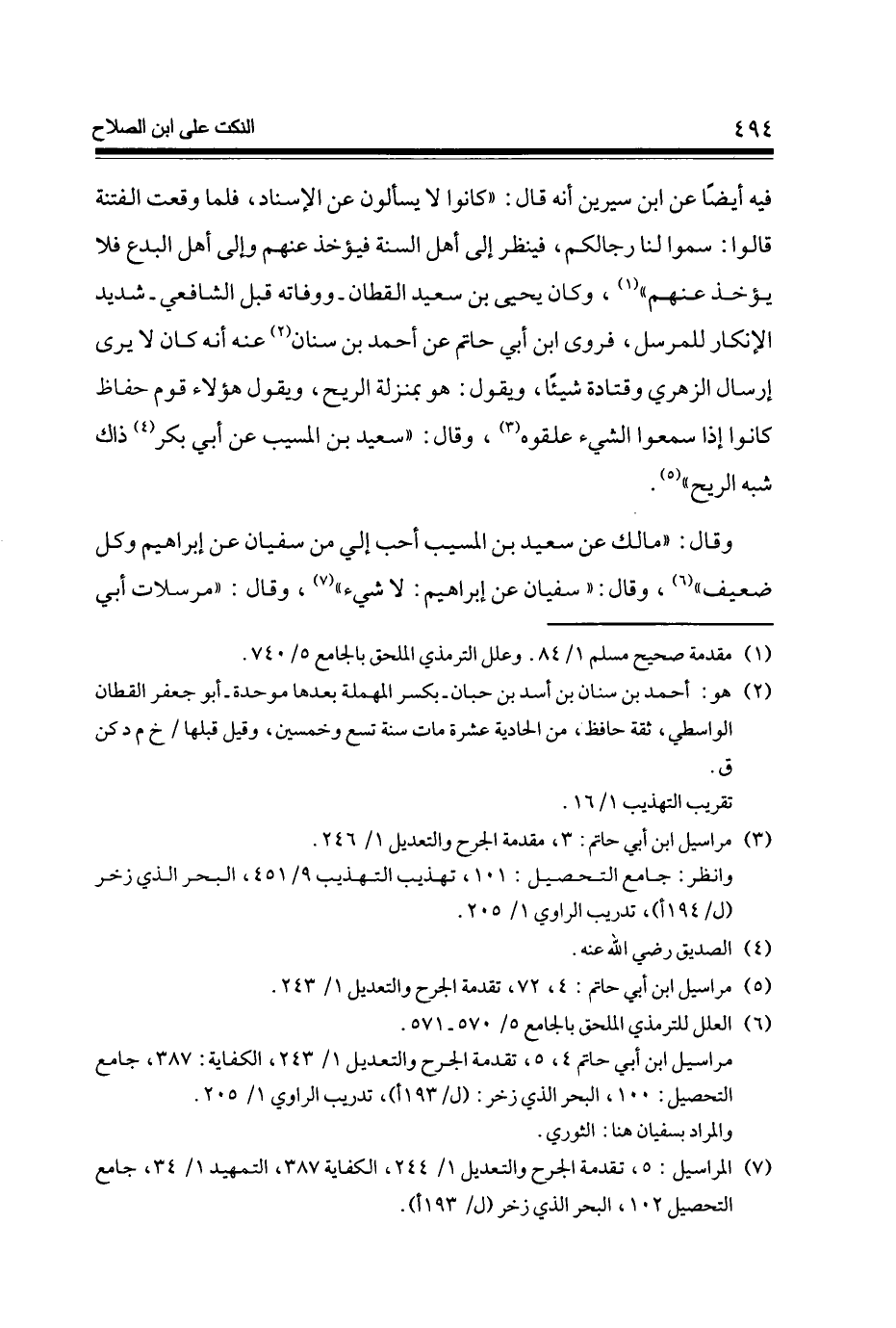فِيهِ أَيْضا عَن ابْن سِيرِين أَنه قَالَ كَانُوا لَا يسْأَلُون عَن الْإِسْنَاد فَلَمَّا وَقعت الْفِتْنَة قَالُوا سموا لنا رجالكم فَينْظر إِلَى أهل السّنة فَيُؤْخَذ عَنْهُم وَإِلَى أهل الْبدع فَلَا يُؤْخَذ عَنْهُم وَكَانَ يحيى بن سعيد الْقطَّان - ووفاته قبل الشَّافِعِي - شَدِيد الْإِنْكَار للمرسل فروى ابْن أبي حَاتِم عَن أَحْمد بن سِنَان عَنهُ أَنه كَانَ لَا يرى إرْسَال الزُّهْرِيّ وَقَتَادَة شَيْئا وَيَقُول هُوَ بِمَنْزِلَة الرّيح وَيَقُول هَؤُلَاءِ قوم حفاظ كَانُوا إِذا سمعُوا الشَّيْء علقوه وَقَالَ سعيد بن الْمسيب عَن أبي بكر ذَاك شبه الرّيح