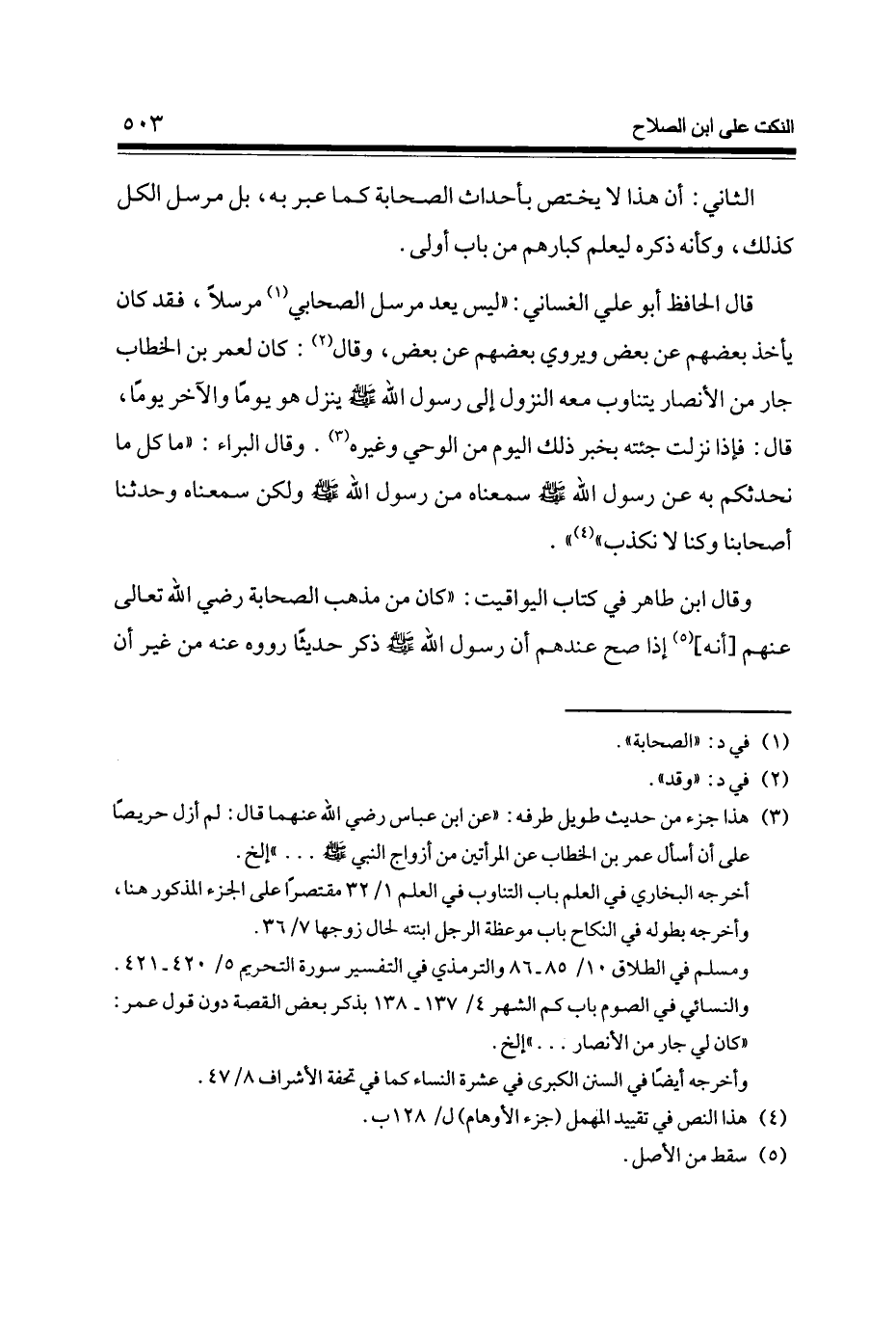 الثَّانِي أَن هَذَا لَا يخْتَص بأحداث الصَّحَابَة كَمَا عبر بِهِ بل مُرْسل الْكل كَذَلِك وَكَأَنَّهُ ذكره ليعلم كبارهم من بَاب أولى