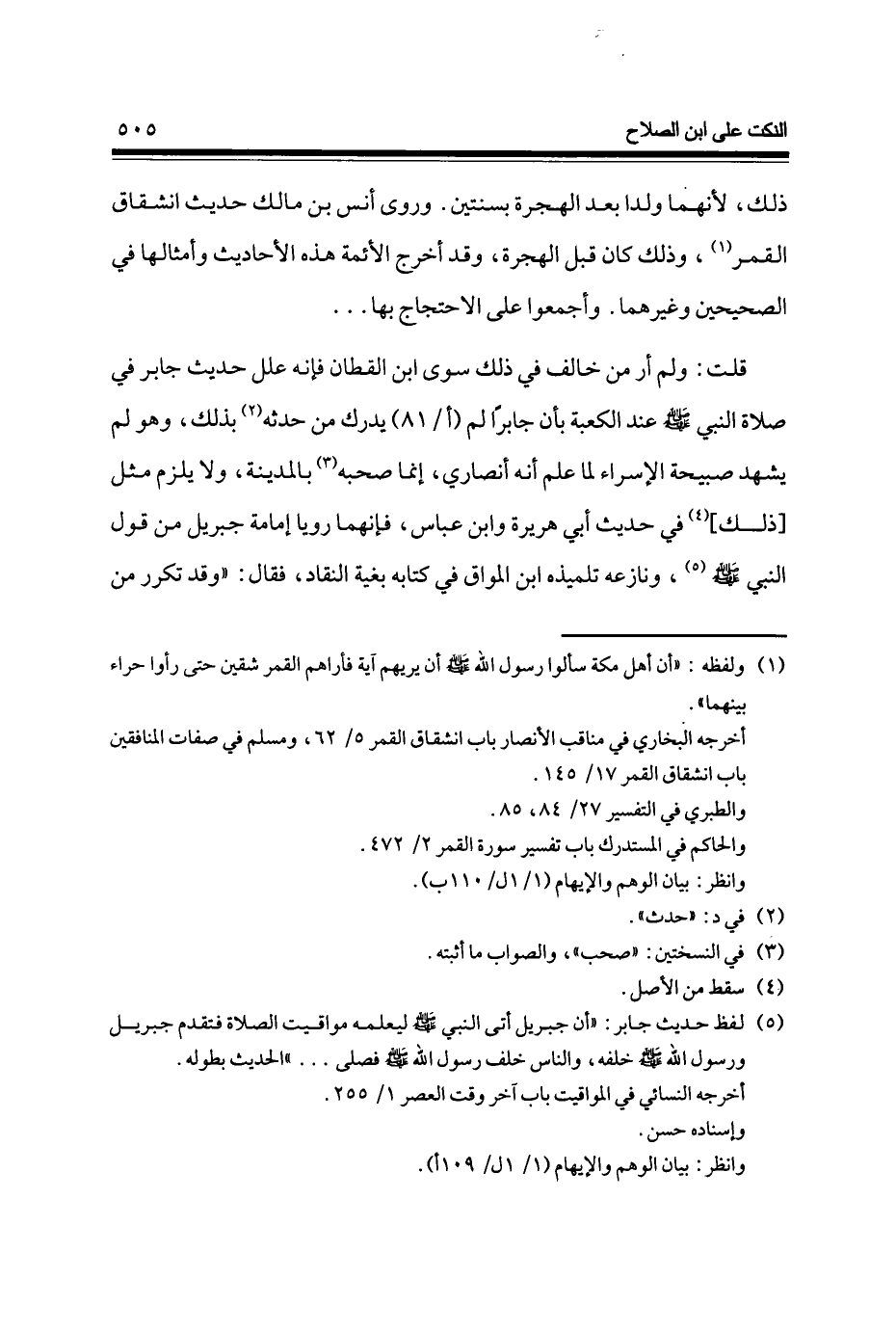 قلت وَلم أر من خَالف فِي ذَلِك سوى ابْن الْقطَّان فَإِنَّهُ علل حَدِيث جَابر فِي صَلَاة النَّبِي صلى الله عَلَيْهِ وَسلم عِنْد الْكَعْبَة بِأَن جَابِرا لم (أ / 81) يدْرك من حَدثهُ بذلك وَهُوَ لم يشْهد صَبِيحَة الْإِسْرَاء لما علم أَنه أَنْصَارِي إِنَّمَا صَحبه بِالْمَدِينَةِ وَلَا يلْزم مثل [ذَلِك] فِي حَدِيث أبي هُرَيْرَة وَابْن عَبَّاس فَإِنَّهُمَا رويا إِمَامَة جِبْرِيل من قَول النَّبِي صلى الله عَلَيْهِ وَسلم ونازعه تِلْمِيذه ابْن الْمواق فِي كِتَابه بغية النقاد فَقَالَ وَقد تكَرر من