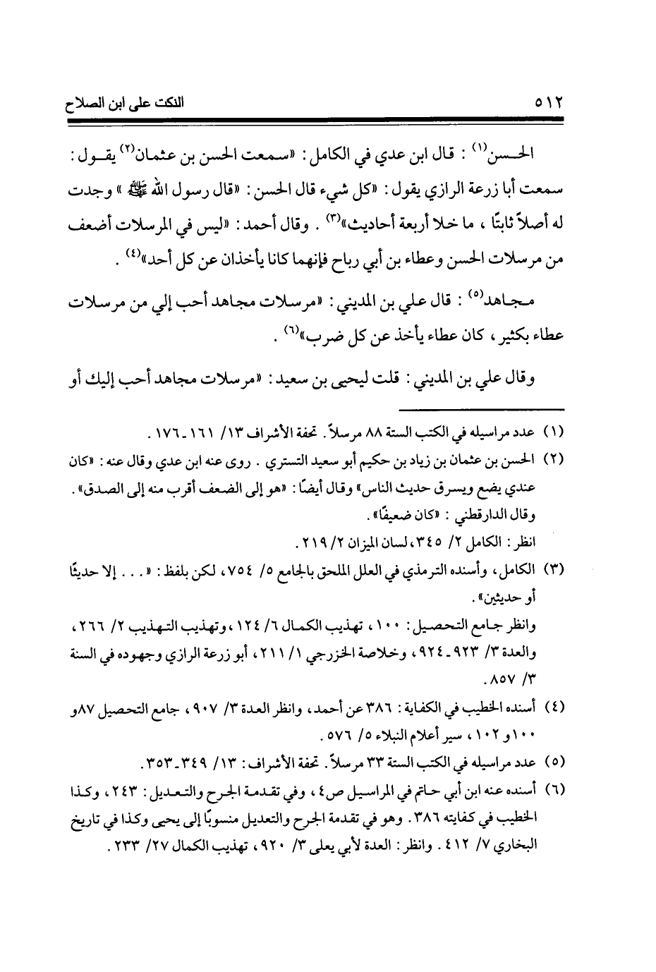 الْحسن قَالَ ابْن عدي فِي الْكَامِل سَمِعت الْحسن بن عُثْمَان يَقُول سَمِعت أَبَا زرْعَة الرَّازِيّ يَقُول كل شَيْء قَالَ الْحسن قَالَ رَسُول الله صلى الله عَلَيْهِ وَسلم وجدت لَهُ أصلا ثَابتا مَا خلا أَرْبَعَة أَحَادِيث وَقَالَ أَحْمد لَيْسَ فِي المرسلات أَضْعَف من مرسلات الْحسن وَعَطَاء بن أبي رَبَاح فَإِنَّهُمَا كَانَا يأخذان عَن كل أحد