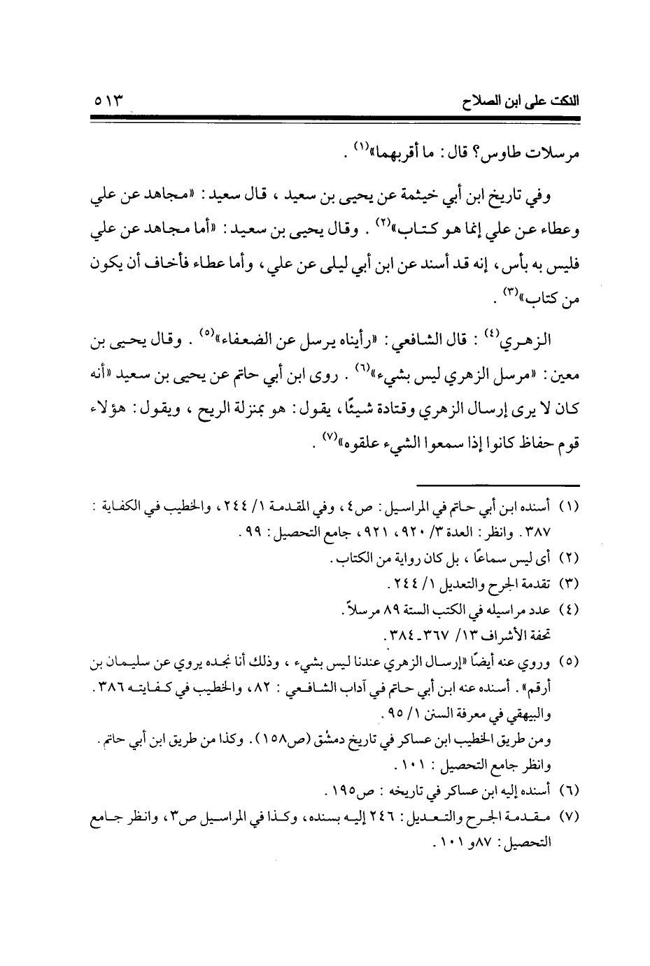 الزُّهْرِيّ قَالَ الشَّافِعِي رَأَيْنَاهُ يُرْسل عَن الضُّعَفَاء وَقَالَ يحيى بن معِين مُرْسل الزُّهْرِيّ لَيْسَ بِشَيْء روى ابْن أبي حَاتِم عَن يحيى بن سعيد أَنه كَانَ لَا يرى إرْسَال الزُّهْرِيّ وَقَتَادَة شَيْئا يَقُول هُوَ بِمَنْزِلَة الرّيح وَيَقُول هَؤُلَاءِ قوم حفاظ كَانُوا إِذا سمعُوا الشَّيْء علقوه