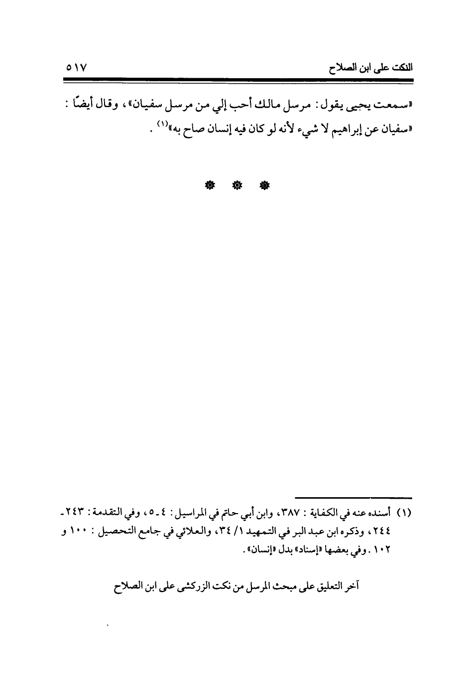 سَمِعت يحيى يَقُول مُرْسل مَالك أحب إِلَيّ من مُرْسل سُفْيَان وَقَالَ أَيْضا سُفْيَان عَن إِبْرَاهِيم لَا شَيْء لِأَنَّهُ لَو كَانَ فِيهِ إِنْسَان صَاح بِهِ