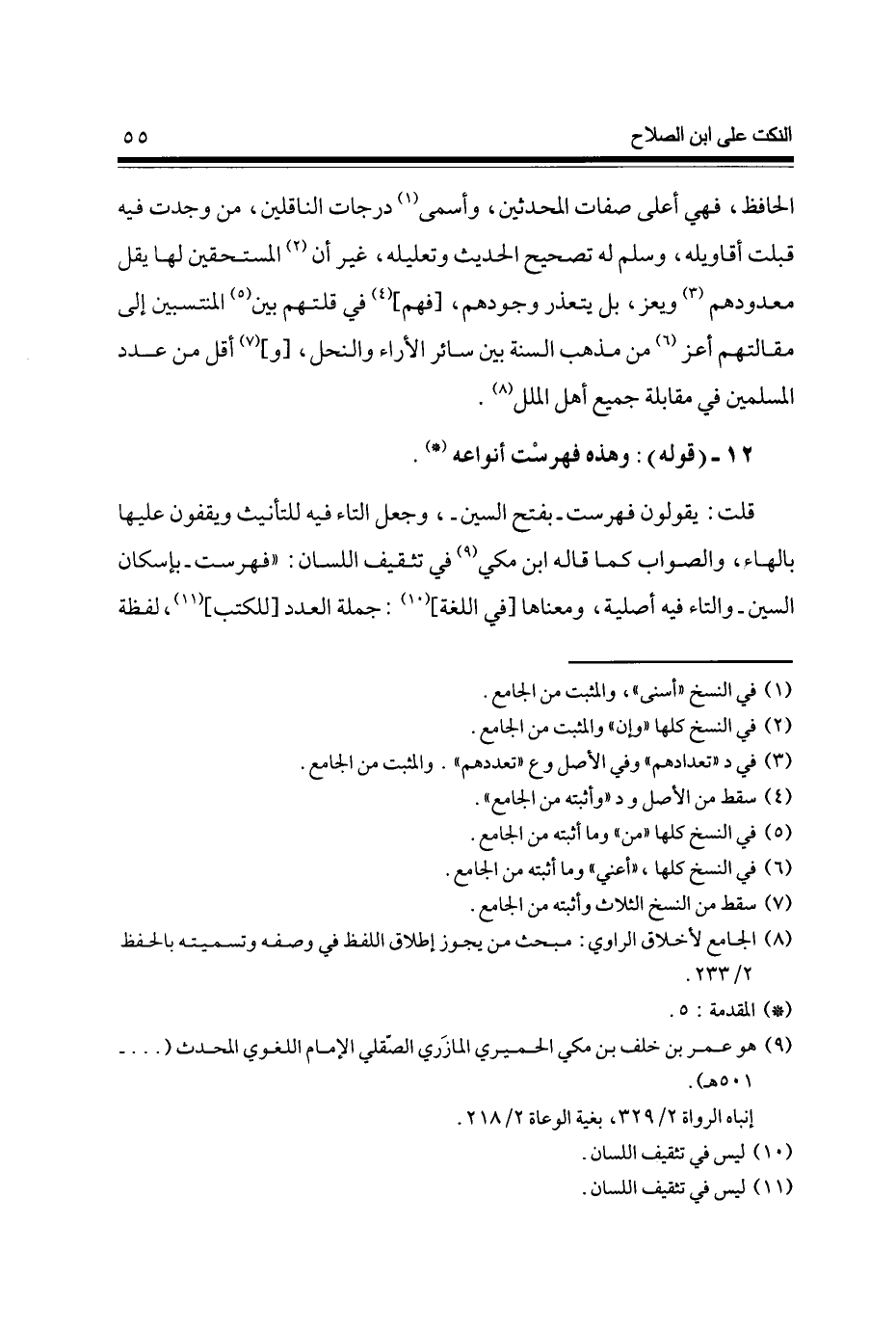 قلت يَقُولُونَ فهرست - بِفَتْح السِّين - وَجعل التَّاء فِيهِ للتأنيث ويقفون عَلَيْهَا بِالْهَاءِ وَالصَّوَاب كَمَا قَالَه ابْن مكي فِي تثقيف اللِّسَان فهرست - بِإِسْكَان السِّين - وَالتَّاء فِيهِ أَصْلِيَّة وَمَعْنَاهَا [فِي اللُّغَة] جملَة الْعدَد [للكتب] لَفْظَة