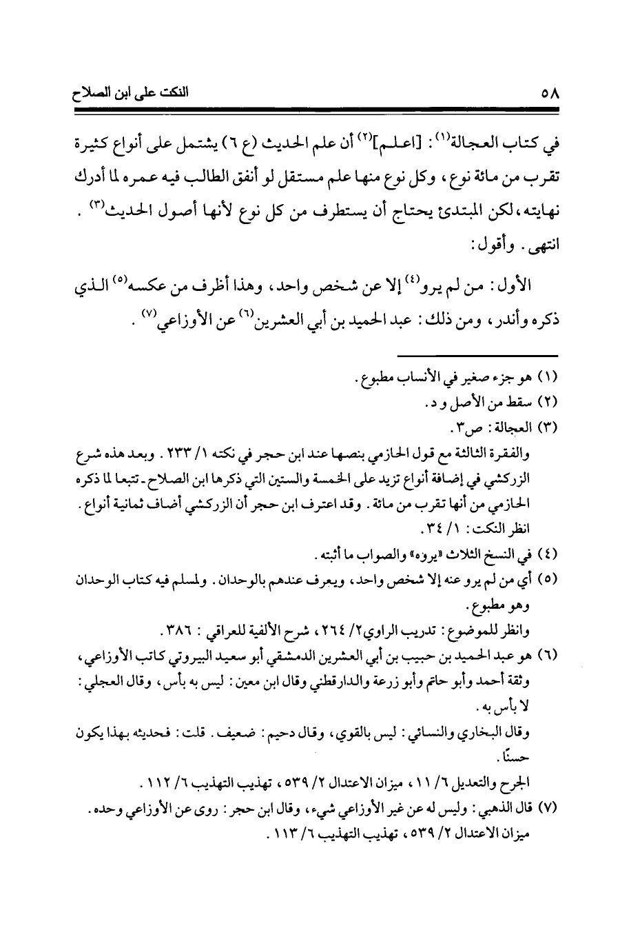 الأول من لم يرو إِلَّا عَن شخص وَاحِد وَهَذَا اظرف من عَكسه الَّذِي ذكره وأندر وَمن ذَلِك عبد الحميد بن أبي الْعشْرين عَن الْأَوْزَاعِيّ
