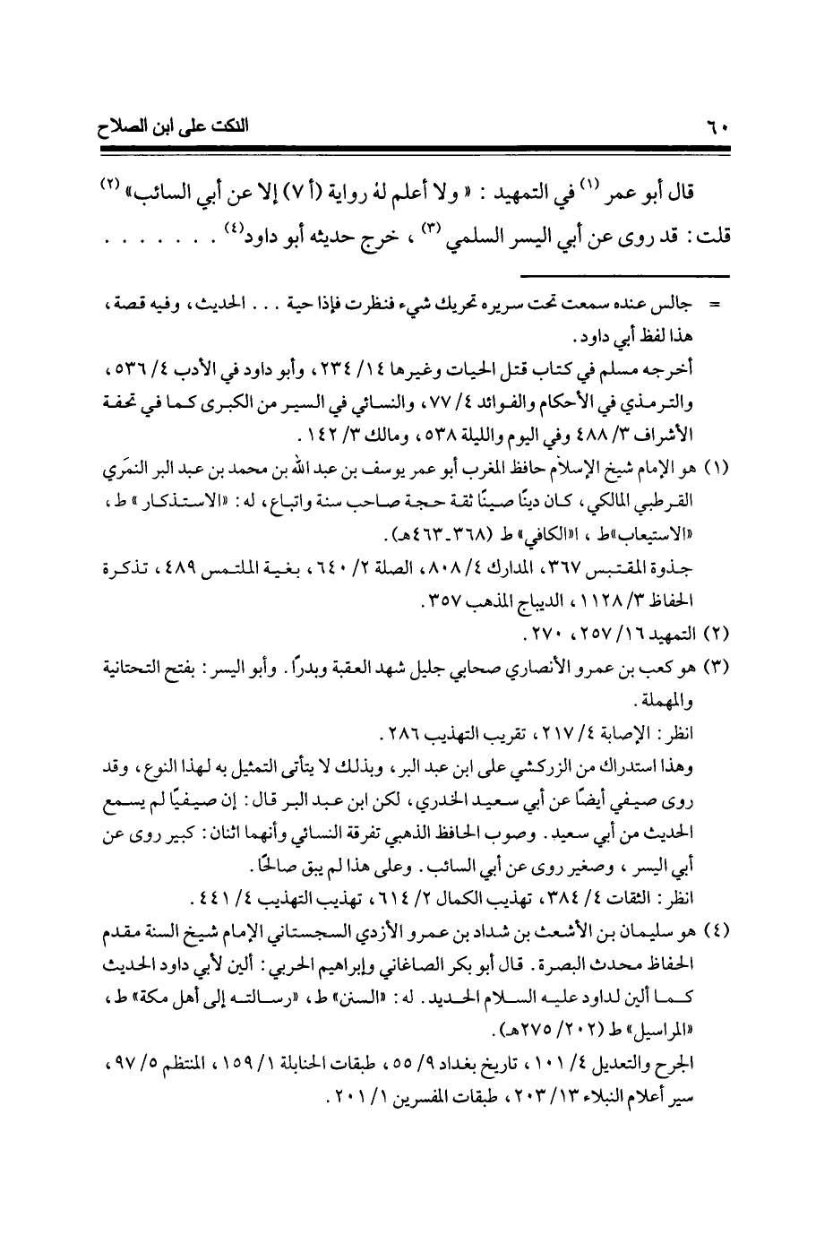 قَالَ أَبُو عمر فِي التَّمْهِيد وَلَا أعلم لَهُ رِوَايَة (أ 7) إِلَّا عَن أبي السَّائِب قلت قد روى عَن أبي الْيُسْر السّلمِيّ خرج حَدِيثه أَبُو دَاوُد