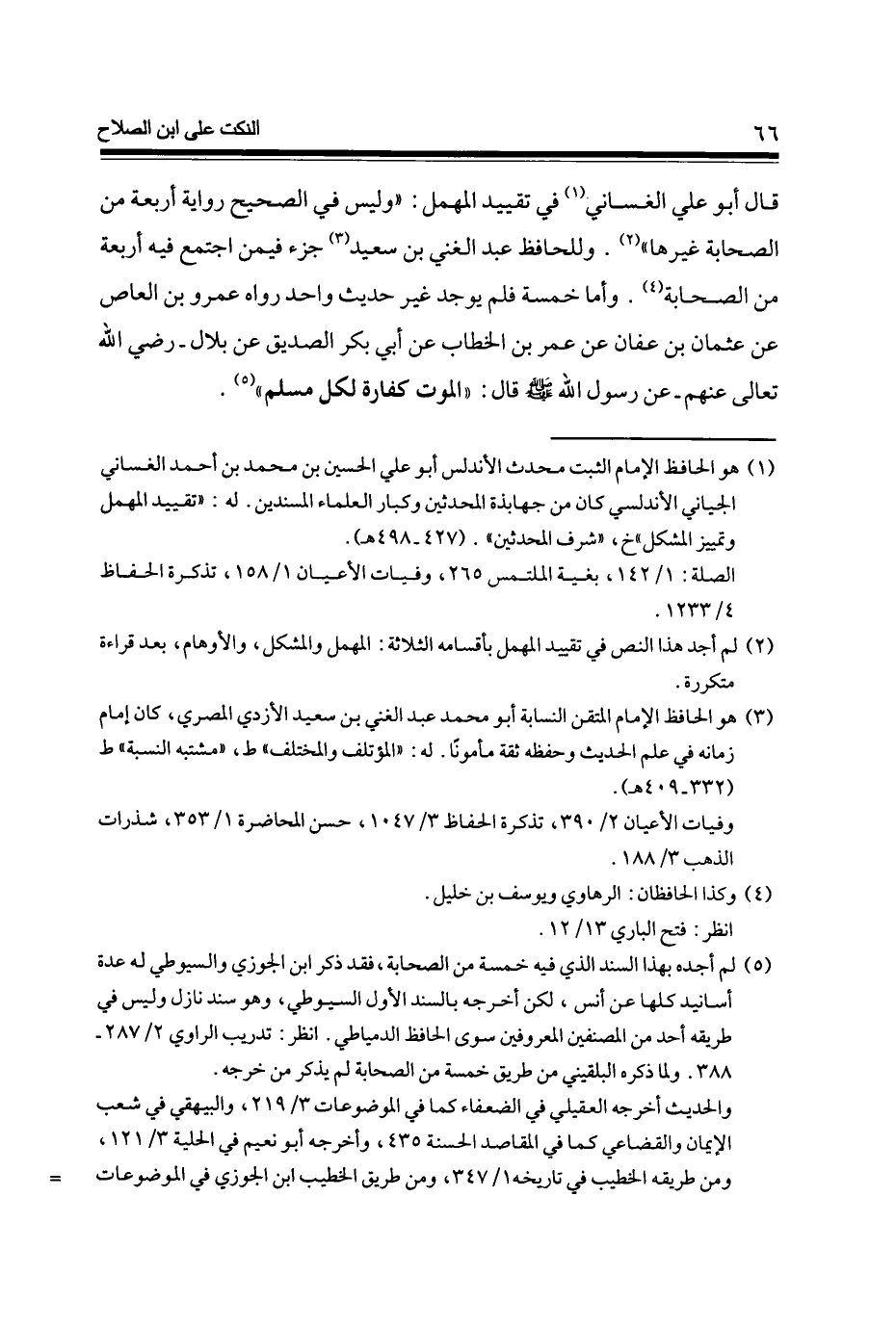 قَالَ أَبُو عَليّ الغساني فِي تَقْيِيد المهمل وَلَيْسَ فِي الصَّحِيح رِوَايَة أَرْبَعَة من الصَّحَابَة غَيرهَا وللحافظ عبد الْغَنِيّ بن سعيد جُزْء فِيمَن اجْتمع فِيهِ أَرْبَعَة من الصَّحَابَة وَأما خَمْسَة فَلم يُوجد غير حَدِيث وَاحِد رَوَاهُ عَمْرو بن الْعَاصِ عَن عُثْمَان بن عَفَّان عَن عمر بن الْخطاب عَن أبي بكر الصّديق عَن بِلَال - رَضِي الله تَعَالَى عَنْهُم - عَن رَسُول الله صلى الله عَلَيْهِ وَسلم قَالَ الْمَوْت كَفَّارَة لكل مُسلم