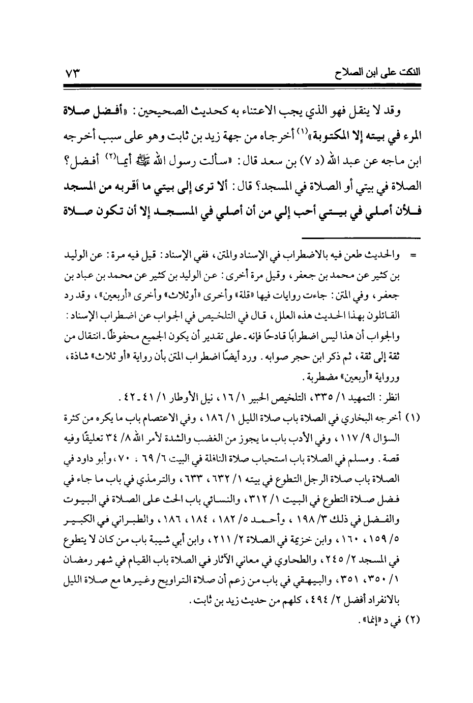وَقد لَا ينْقل فَهُوَ الَّذِي يجب الاعتناء بِهِ كَحَدِيث الصَّحِيحَيْنِ أفضل صَلَاة الْمَرْء فِي بَيته إِلَّا الْمَكْتُوبَة أَخْرجَاهُ من جِهَة زيد بن ثَابت وَهُوَ على سَبَب أخرجه ابْن مَاجَه عَن عبد الله (د 7) بن سعد قَالَ سَأَلت رَسُول الله صلى الله عَلَيْهِ وَسلم أَيّمَا أفضل الصَّلَاة فِي بَيْتِي أَو الصَّلَاة فِي الْمَسْجِد قَالَ أَلا ترى إِلَى بَيْتِي مَا أقربه من الْمَسْجِد فَلِأَن أُصَلِّي فِي بَيْتِي أحب إِلَيّ من أَن أُصَلِّي فِي الْمَسْجِد إِلَّا أَن تكون صَلَاة