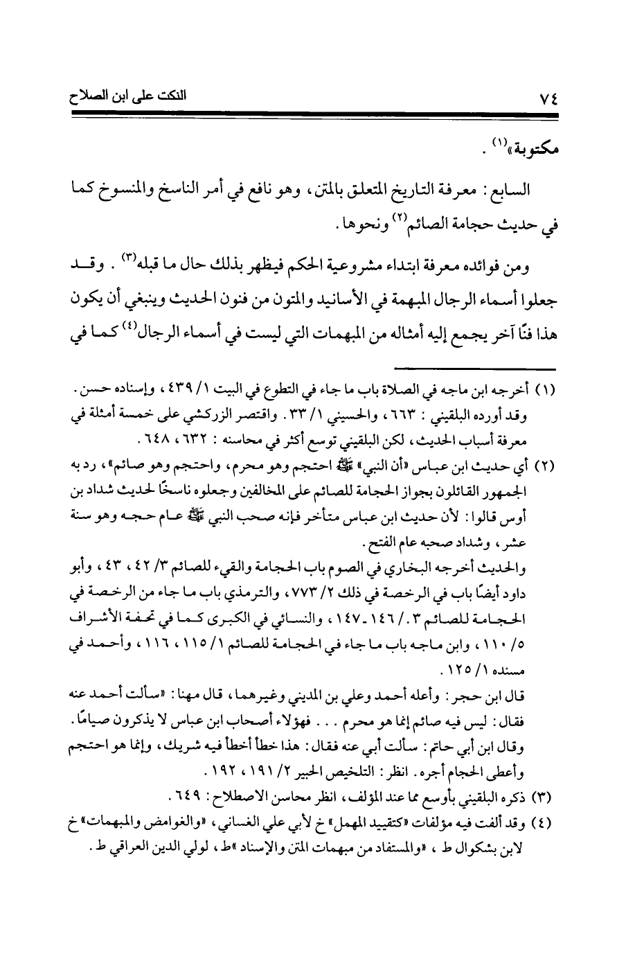 وَمن فَوَائده معرفَة ابْتِدَاء مَشْرُوعِيَّة الحكم فَيظْهر بذلك حَال مَا قبله وَقد جعلُوا أَسمَاء الرِّجَال المبهمة فِي الْأَسَانِيد والمتون من فنون الحَدِيث وَيَنْبَغِي أَن يكون هَذَا فَنًّا آخر يجمع إِلَيْهِ أَمْثَاله من المبهمات الَّتِي لَيست فِي أَسمَاء الرِّجَال كَمَا فِي