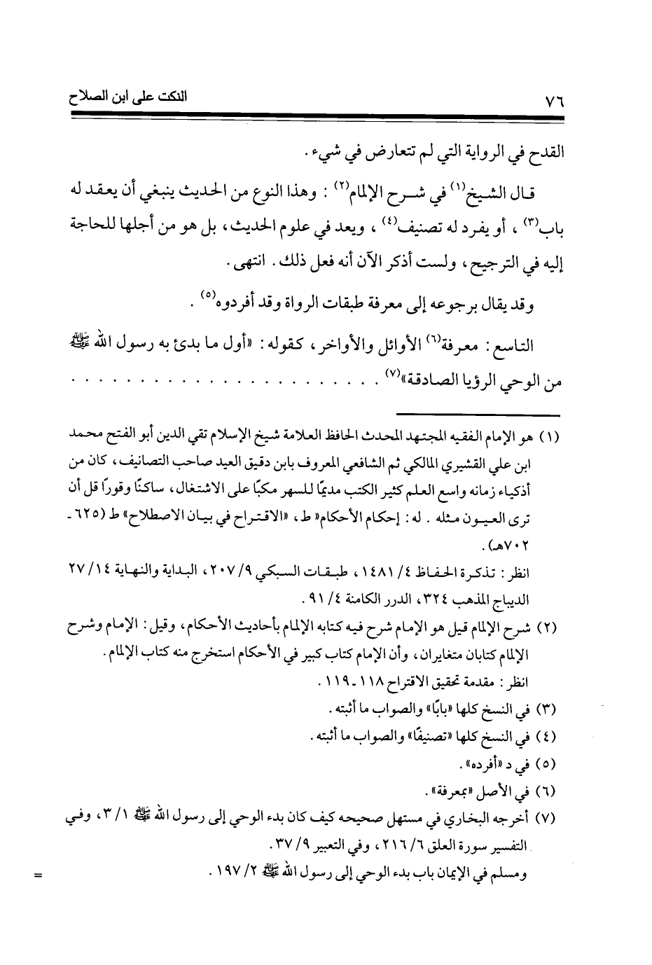 قَالَ الشَّيْخ فِي شرح الْإِلْمَام وَهَذَا النَّوْع من الحَدِيث يَنْبَغِي أَن يعْقد لَهُ بَاب أَو يفرد لَهُ تصنيف ويعد فِي عُلُوم الحَدِيث بل هُوَ من أجلهَا للْحَاجة إِلَيْهِ فِي التَّرْجِيح وَلست أذكر الْآن أَنه فعل ذَلِك انْتهى