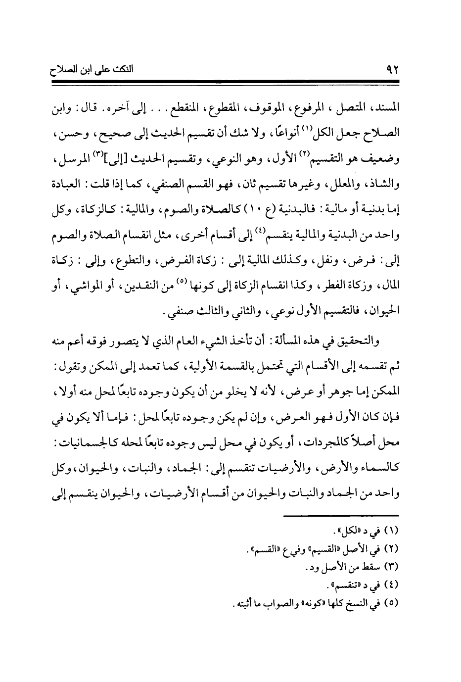 الْمسند الْمُتَّصِل الْمَرْفُوع الْمَوْقُوف الْمَقْطُوع الْمُنْقَطع إِلَى آخِره قَالَ وَابْن الصّلاح جعل الْكل أنواعا وَلَا شكّ أَن تَقْسِيم الحَدِيث إِلَى صَحِيح وَحسن وَضَعِيف هُوَ التَّقْسِيم الأول وَهُوَ النوعي وتقسيم الحَدِيث [إِلَى] الْمُرْسل والشاذ والمعلل وَغَيرهَا تَقْسِيم ثَان فَهُوَ الْقسم الصنفي كَمَا إِذا قلت الْعِبَادَة إِمَّا بدنية أَو مَالِيَّة فالبدنية (ع 10) كَالصَّلَاةِ وَالصَّوْم والمالية كَالزَّكَاةِ وكل وَاحِد من الْبَدَنِيَّة والمالية يَنْقَسِم إِلَى أَقسَام أُخْرَى مثل انقسام الصَّلَاة وَالصَّوْم إِلَى فرض وَنفل وَكَذَلِكَ الْمَالِيَّة إِلَى زَكَاة الْفَرْض والتطوع وَإِلَى زَكَاة المَال وَزَكَاة الْفطر وَكَذَا انقسام الزَّكَاة إِلَى كَونهَا من النَّقْدَيْنِ أَو الْمَوَاشِي أَو الْحَيَوَان فالتقسيم الأول نَوْعي وَالثَّانِي وَالثَّالِث صنفي
