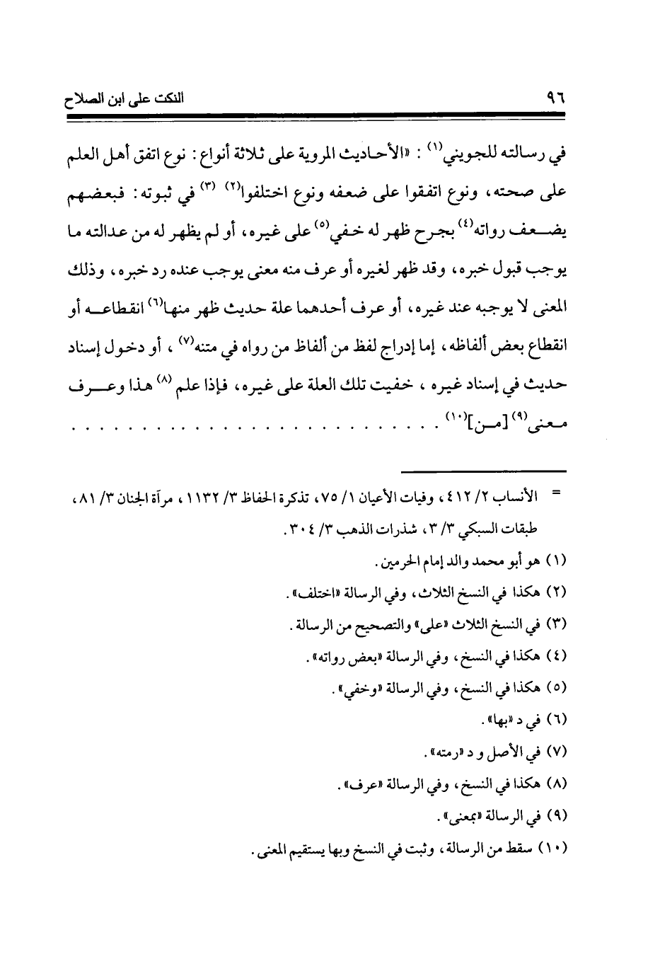 فِي رسَالَته للجويني الْأَحَادِيث المروية على ثَلَاثَة أَنْوَاع نوع اتّفق أهل الْعلم على صِحَّته وَنَوع اتَّفقُوا على ضعفه وَنَوع اخْتلفُوا فِي ثوبته فبعضهم يضعف رُوَاته بِجرح ظهر لَهُ خَفِي على غَيره أَو لم يظْهر لَهُ من عَدَالَته مَا يُوجب قبُول خَبره وَقد ظهر لغيره أَو عرف مِنْهُ معنى يُوجب عِنْده رد خَبره وَذَلِكَ الْمَعْنى لَا يُوجِبهُ عِنْد غَيره أَو عرف أَحدهمَا عِلّة حَدِيث ظهر مِنْهَا انْقِطَاعه اَوْ انْقِطَاع بعض أَلْفَاظه إِمَّا إدراج لفظ من أَلْفَاظ من رَوَاهُ فِي مَتنه أَو دُخُول إِسْنَاد حَدِيث فِي إِسْنَاد غَيره خفيت تِلْكَ الْعلَّة على غَيره فَإِذا علم هَذَا وَعرف معنى [من]
