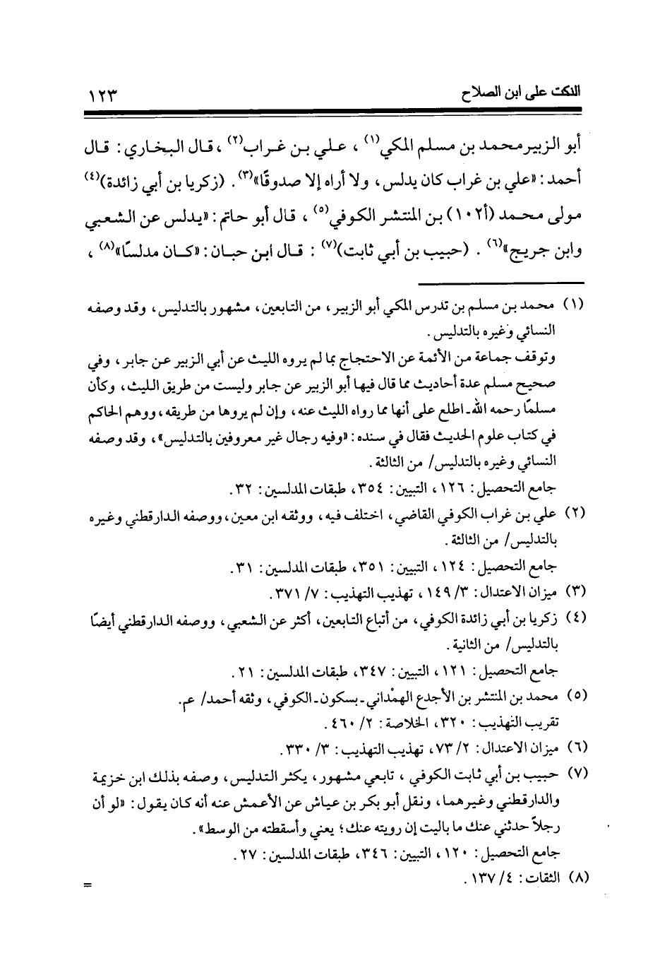 أَبُو الزبير مُحَمَّد بن مُسلم الْمَكِّيّ عَليّ بن غراب قَالَ البُخَارِيّ قَالَ أَحْمد عَليّ بن غراب كَانَ يُدَلس وَلَا أرَاهُ إِلَّا صَدُوقًا (زَكَرِيَّا بن أبي زَائِدَة) مولى مُحَمَّد (أ 102) بن الْمُنْتَشِر الْكُوفِي قَالَ أَبُو حَاتِم يُدَلس عَن الشّعبِيّ وَابْن جريج (حبيب بن أبي ثَابت) قَالَ ابْن حبَان كَانَ مدلسا