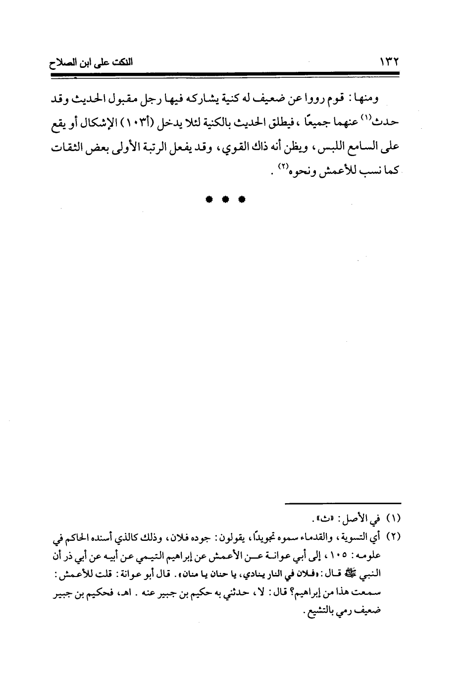 وَمِنْهَا قوم رووا عَن ضَعِيف لَهُ كنية يُشَارِكهُ فِيهَا رجل مَقْبُول الحَدِيث وَقد حدث عَنْهُمَا جَمِيعًا فيطلق الحَدِيث بالكنية لِئَلَّا يدْخل (أ 103) الْإِشْكَال أَو يَقع على السَّامع اللّبْس ويظن أَنه ذَاك الْقوي وَقد يفعل الرُّتْبَة الأولى بعض الثِّقَات كَمَا نسب للأعمش وَنَحْوه