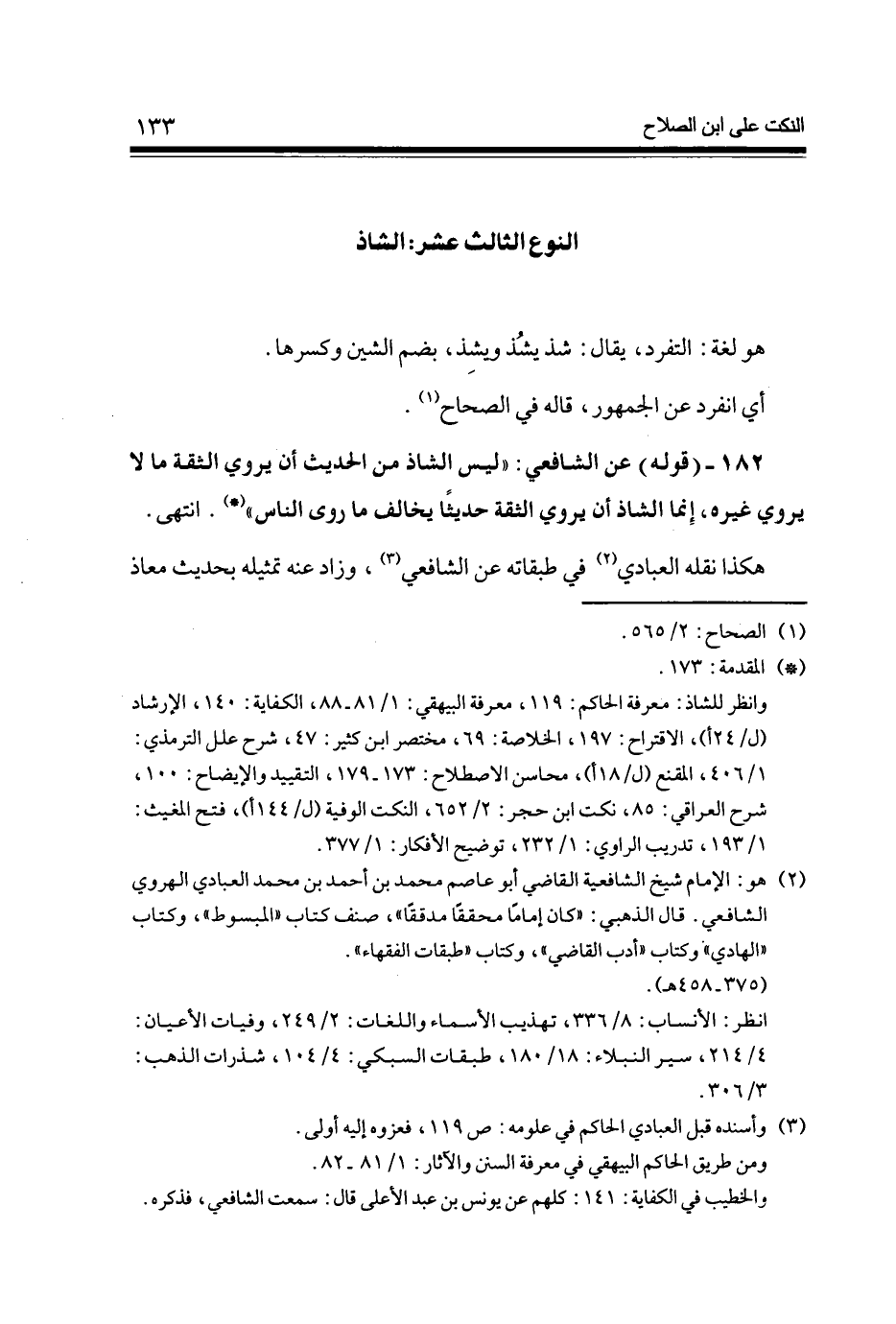 182 - (قَوْله) عَن الشَّافِعِي لَيْسَ الشاذ من الحَدِيث أَن يروي الثِّقَة مَالا يروي غَيره إِنَّمَا الشاذ أَن يروي الثِّقَة حَدِيثا يُخَالف مَا روى النَّاس انْتهى