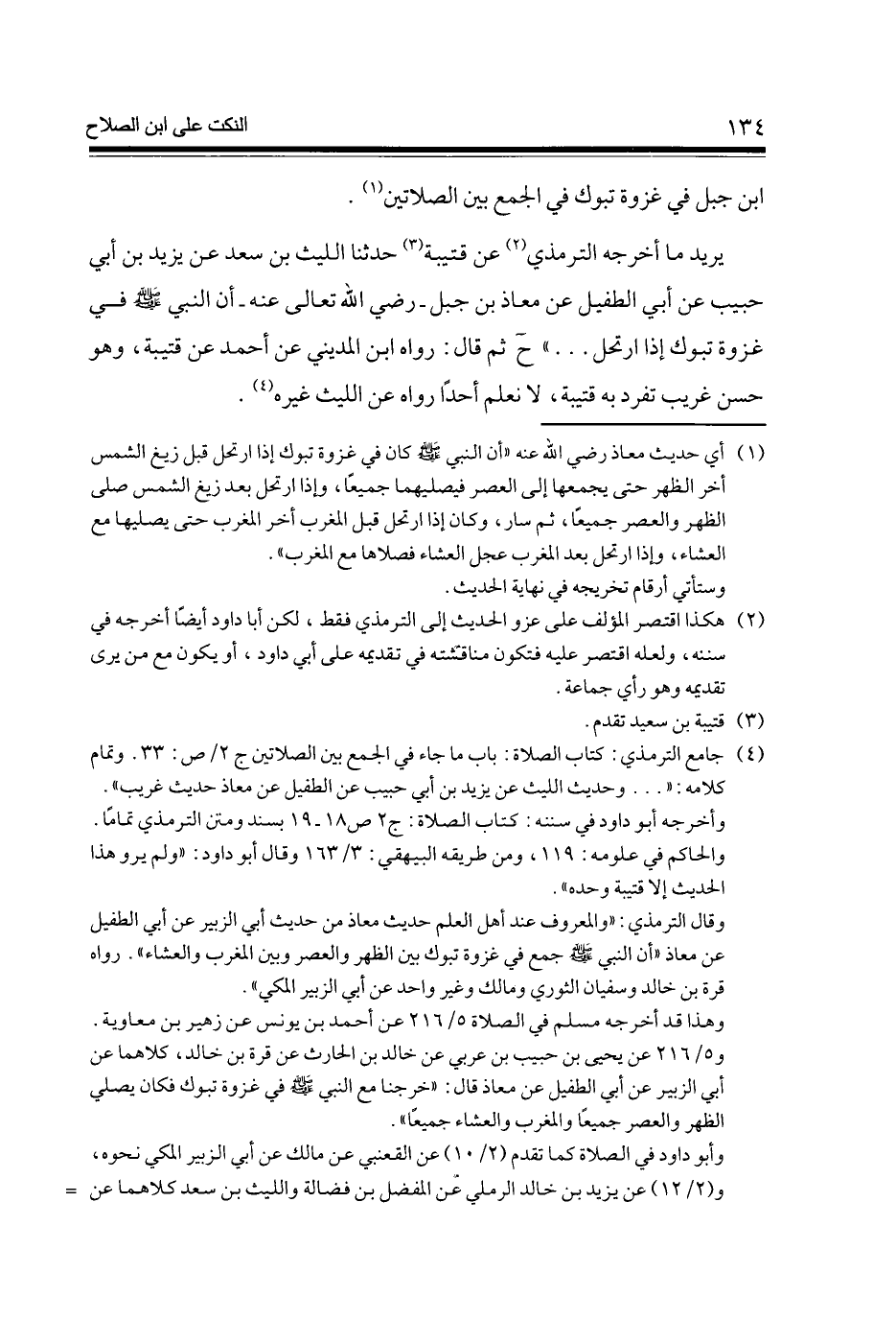يُرِيد مَا أخرجه التِّرْمِذِيّ عَن قُتَيْبَة حَدثنَا اللَّيْث بن سعد عَن يزِيد بن أبي حبيب عَن أبي الطُّفَيْل عَن معَاذ بن جبل - رَضِي الله تَعَالَى عَنهُ - أَن النَّبِي صلى الله عَلَيْهِ وَسلم فِي غَزْوَة تَبُوك إِذا ارتحل ح ~ ثمَّ قَالَ رَوَاهُ ابْن الْمَدِينِيّ عَن أَحْمد عَن قُتَيْبَة وَهُوَ حسن غَرِيب تفرد بِهِ قُتَيْبَة لَا نعلم أحدا رَوَاهُ عَن اللَّيْث غَيره