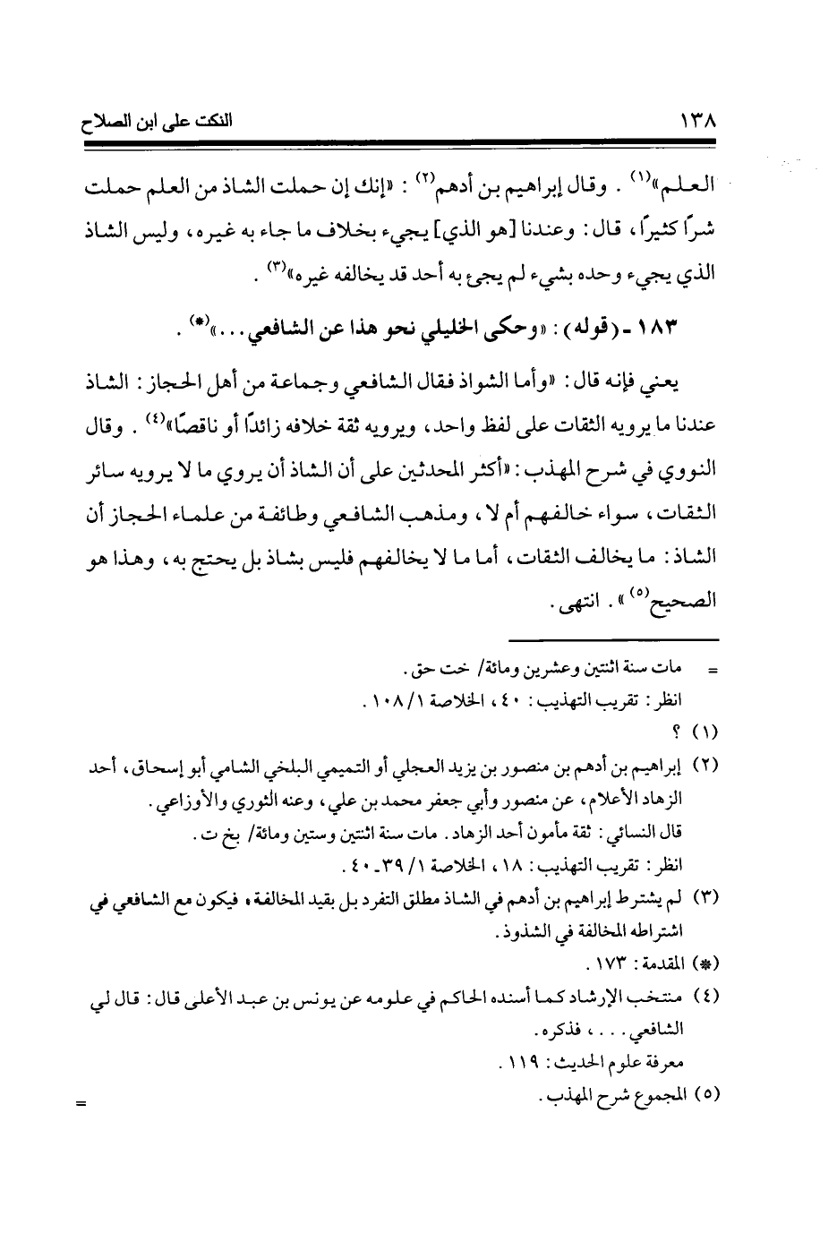 الْعلم وَقَالَ إِبْرَاهِيم بن أدهم إِنَّك إِن حملت الشاذ من الْعلم حملت شرا كثيرا قَالَ وَعِنْدنَا [هُوَ الَّذِي] يَجِيء بِخِلَاف مَا جَاءَ بِهِ غَيره وَلَيْسَ الشاذ الَّذِي يَجِيء وَحده بِشَيْء لم يَجِيء بِهِ أحد قد يُخَالِفهُ غَيره