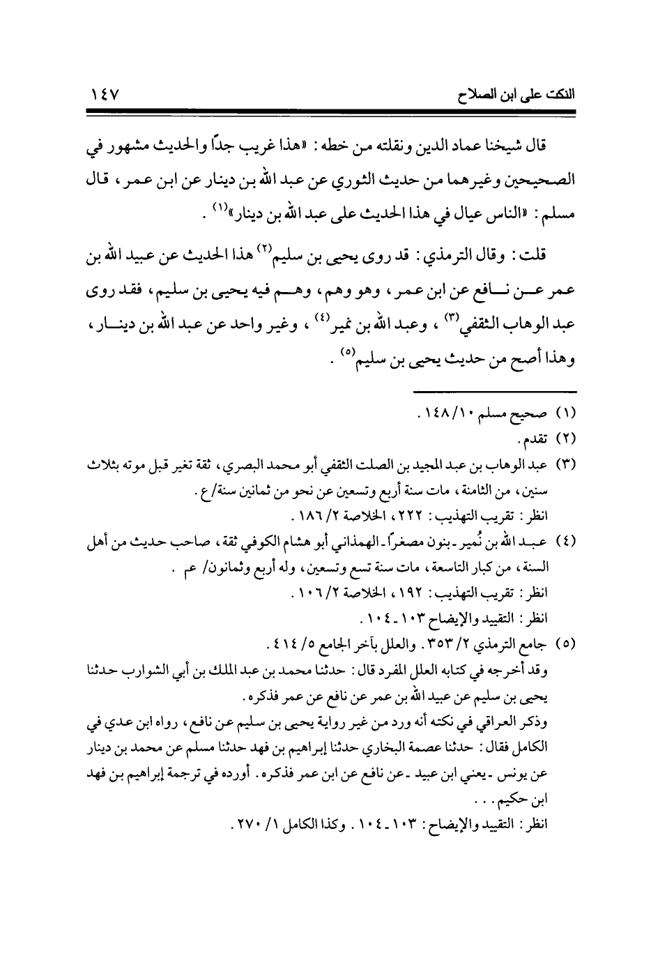 قلت وَقَالَ التِّرْمِذِيّ قد روى يحيى بن سليم هَذَا الحَدِيث عَن عبيد الله بن عمر عَن نَافِع عَن ابْن عمر وَهُوَ وهم وهم فِيهِ يحيى بن سليم فقد روى عبد الْوَهَّاب الثَّقَفِيّ وَعبد الله بن نمير وَغير وَاحِد عَن عبد الله بن دِينَار وَهَذَا أصح من حَدِيث يحيى بن سليم