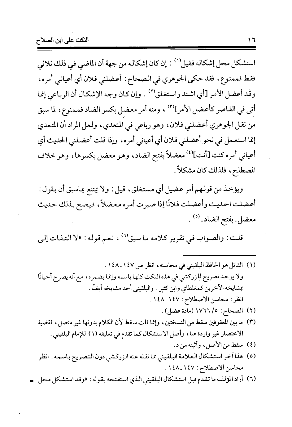 اسْتشْكل مَحل إشكاله فَقيل إِن كَانَ إشكاله من جِهَة أَن الْمَاضِي فِي ذَلِك ثلاثي فَقَط فَمَمْنُوع فقد حكى الْجَوْهَرِي فِي الصِّحَاح أعضلني فلَان أَي أعياني أمره وَقد أعضل الْأَمر [أَي اشْتَدَّ واستغلق وَإِن كَانَ وَجه الْإِشْكَال أَن الرباعي إِنَّمَا أَتَى فِي الْقَاصِر كأعضل الْأَمر] وَمِنْه أَمر معضل بِكَسْر الضَّاد فَمَمْنُوع لما سبق من نقل الْجَوْهَرِي أعضلني فلَان وَهُوَ رباعي فِي الْمُتَعَدِّي وَلَعَلَّ المُرَاد أَن الْمُتَعَدِّي إِنَّمَا اسْتعْمل فِي نَحْو أعضلني فلَان أَي أعياني أمره وَإِذا قلت أعضلني الحَدِيث أَي أعياني أمره كنت [أَنْت] معضلا بِفَتْح الضَّاد وَهُوَ معضل بِكَسْرِهَا وَهُوَ خلاف المصطلح فَلذَلِك كَانَ مُشكلا