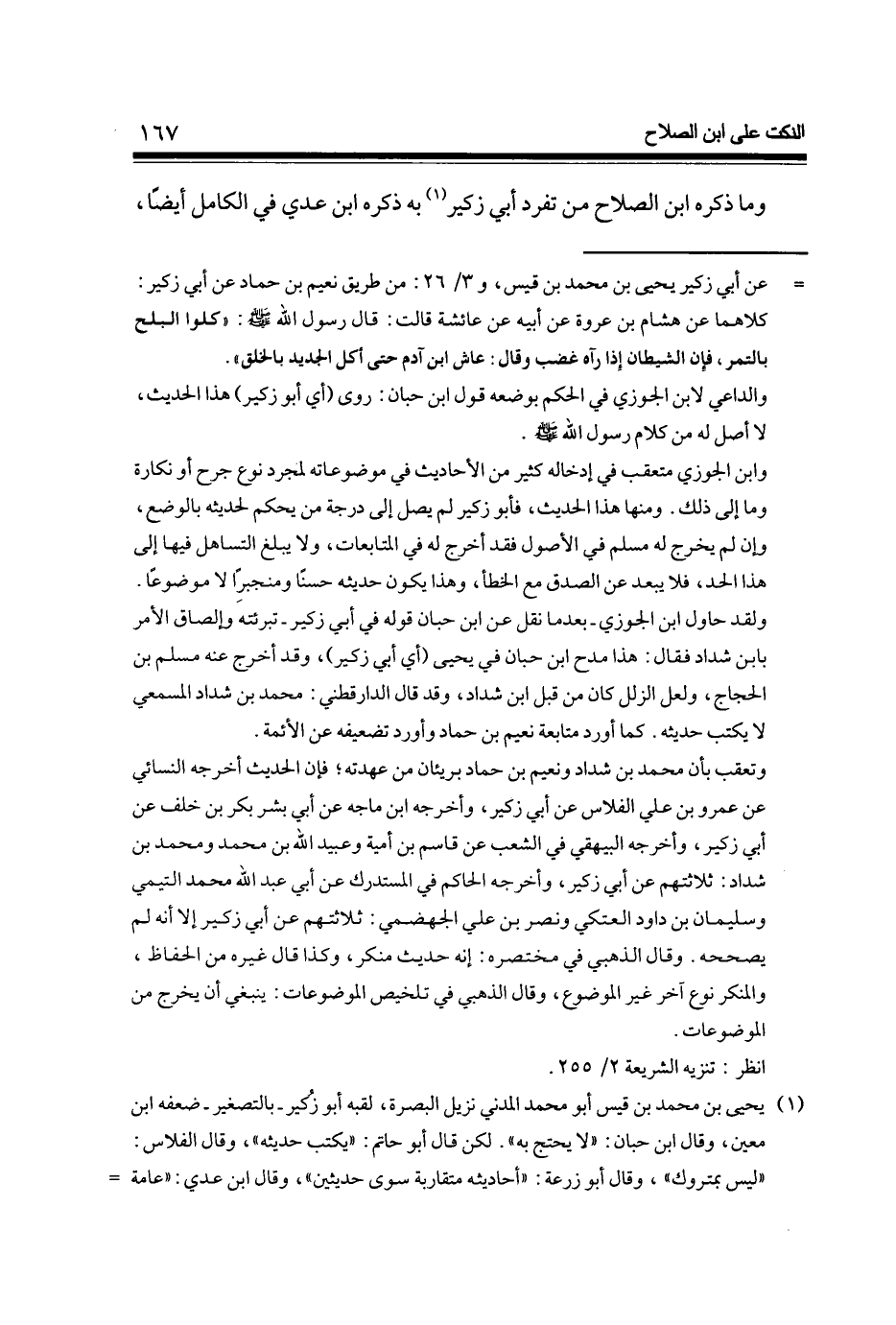 وَمَا ذكره ابْن الصّلاح من تفرد أبي زُكَيْرٍ بِهِ ذكره ابْن عدي فِي الْكَامِل أَيْضا