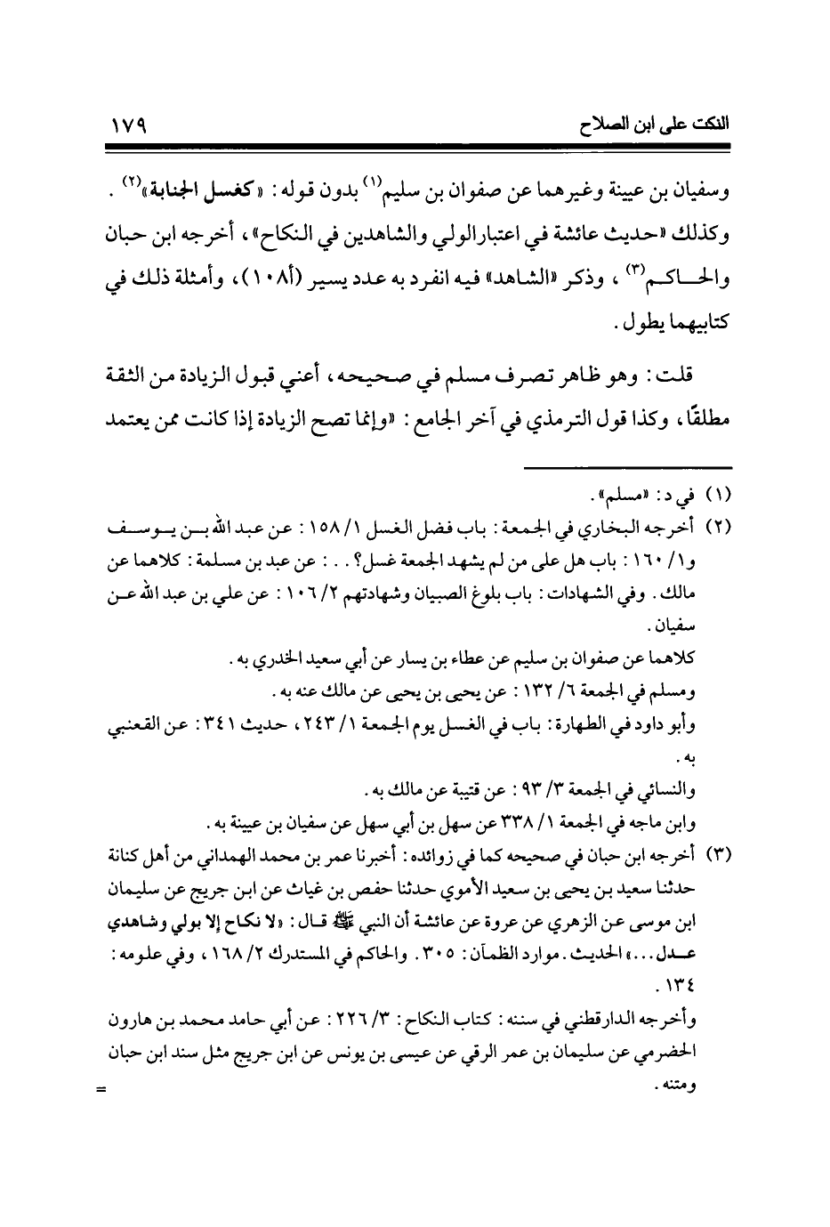 وسُفْيَان بن عُيَيْنَة وَغَيرهمَا عَن صَفْوَان بن سليم بِدُونِ قَوْله كَغسْل الْجَنَابَة وَكَذَلِكَ حَدِيث عَائِشَة فِي اعْتِبَار الْوَلِيّ والشاهدين فِي النِّكَاح أخرجه ابْن حبَان وَالْحَاكِم وَذكر الشَّاهِد فِيهِ انْفَرد بِهِ عدد يسير (أ 108) وأمثلة ذَلِك فِي كِتَابَيْهِمَا يطول
