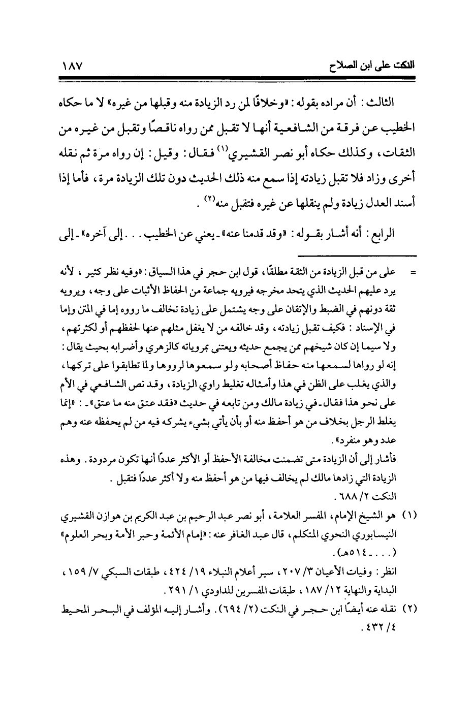 الثَّالِث أَن مُرَاده بقوله وَخِلَافًا لمن رد الزِّيَادَة مِنْهُ وَقبلهَا من غَيره لَا مَا حَكَاهُ الْخَطِيب عَن فرقة من الشَّافِعِيَّة أَنَّهَا لَا تقبل مِمَّن رَوَاهُ نَاقِصا وَتقبل من غَيره من الثِّقَات وَكَذَلِكَ حَكَاهُ أَبُو نصر الْقشيرِي فَقَالَ وَقيل إِن رَوَاهُ مرّة ثمَّ نَقله أُخْرَى وَزَاد فَلَا تقبل زِيَادَته إِذا سمع مِنْهُ ذَلِك الحَدِيث دون تِلْكَ الزِّيَادَة مرّة فَأَما إِذا أسْند الْعدْل زِيَادَة وَلم ينقلها عَن غَيره فَتقبل مِنْهُ
