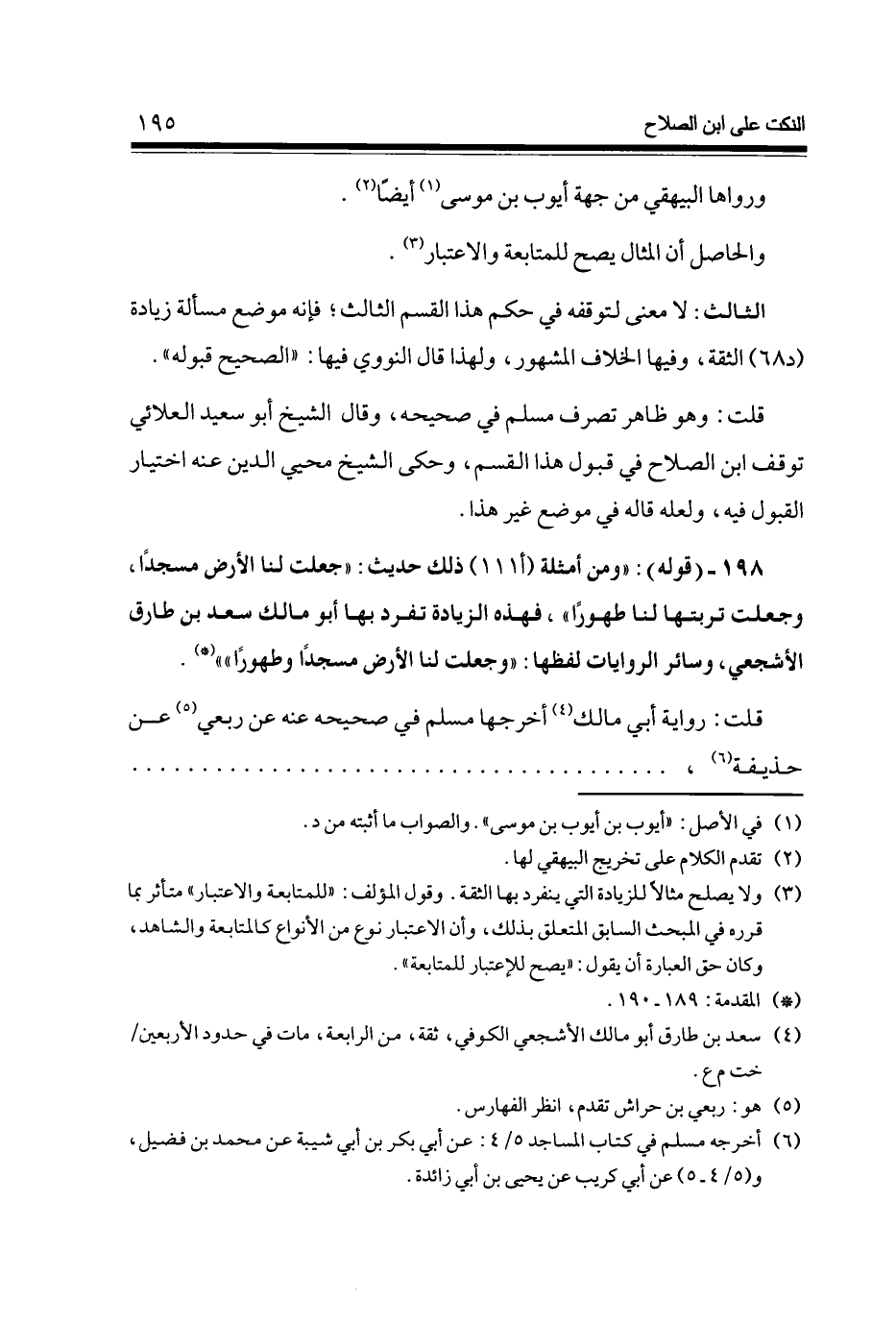 198 - (قَوْله) وَمن أَمْثِلَة (أ 111) ذَلِك حَدِيث جعلت لنا الأَرْض مَسْجِدا وَجعلت تربَتهَا لنا طهُورا فَهَذِهِ الزِّيَادَة تفرد بهَا أَبُو مَالك سعد بن طَارق الْأَشْجَعِيّ وَسَائِر الرِّوَايَات لَفظهَا وَجعلت لنا الأَرْض مَسْجِدا وَطهُورًا