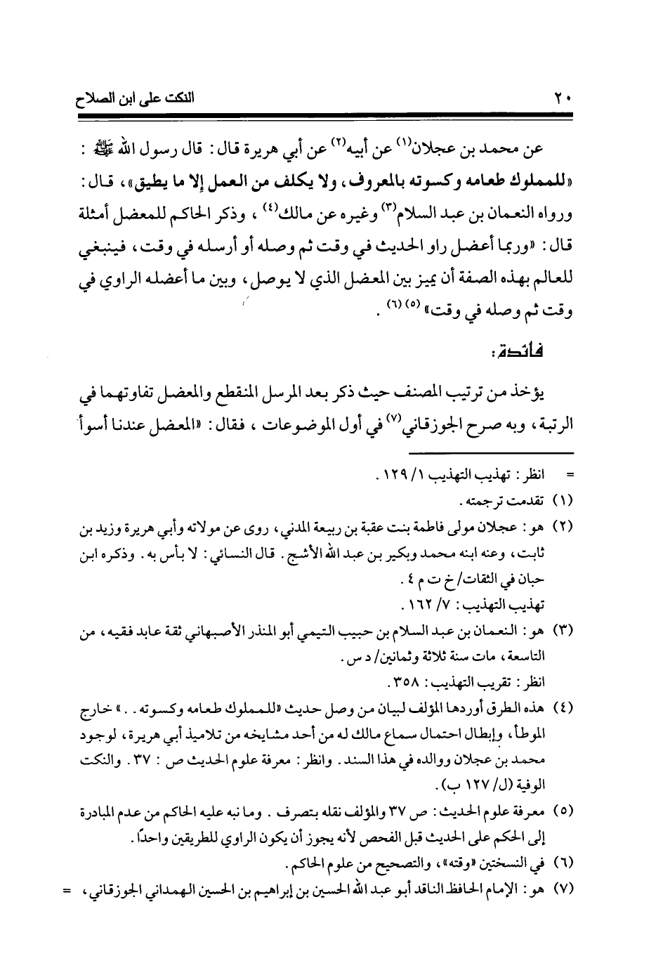 عَن مُحَمَّد بن عجلَان عَن أَبِيه عَن أبي هُرَيْرَة قَالَ قَالَ رَسُول الله صلى الله عَلَيْهِ وَسلم للمملوك طَعَامه وَكسوته بِالْمَعْرُوفِ وَلَا يُكَلف من الْعَمَل إِلَّا مَا يُطيق قَالَ وَرَوَاهُ النُّعْمَان بن عبد السَّلَام وَغَيره عَن مَالك وَذكر الْحَاكِم للمعضل أَمْثِلَة قَالَ وَرُبمَا أعضل راو الحَدِيث فِي وَقت ثمَّ وَصله أَو أرْسلهُ فِي وَقت فَيَنْبَغِي للْعَالم بِهَذِهِ الصّفة أَن يُمَيّز بَين المعضل الَّذِي لَا يُوصل وَبَين مَا أعضله الرَّاوِي فِي وَقت ثمَّ وَصله فِي وَقت
