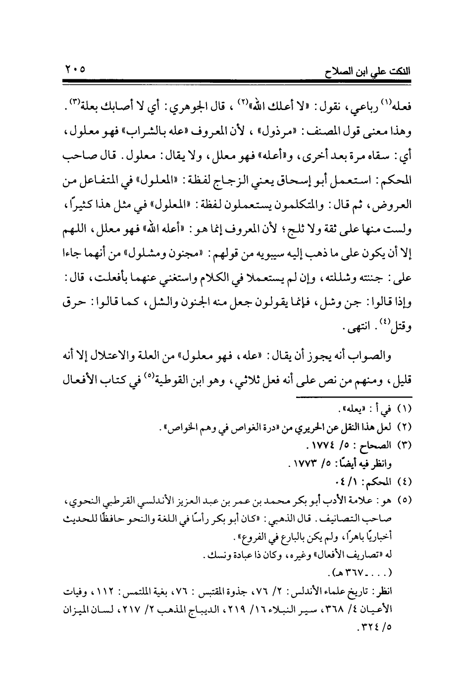وَالصَّوَاب أَنه يجوز أَن يُقَال عله فَهُوَ مَعْلُول من الْعلَّة والاعتلال إِلَّا أَنه قَلِيل وَمِنْهُم من نَص على أَنه فعل ثلاثي وَهُوَ ابْن الْقُوطِيَّة فِي كتاب الْأَفْعَال