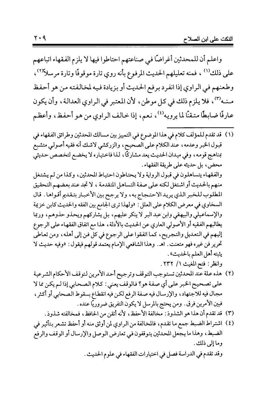وَاعْلَم أَن للمحدثين أغراضا فِي صناعتهم احتاطوا فِيهَا لَا يلْزم الْفُقَهَاء اتباعهم على ذَلِك فَمِنْهُ تَعْلِيلهم الحَدِيث الْمَرْفُوع بِأَنَّهُ رُوِيَ تَارَة مَوْقُوفا وَتارَة مُرْسلا وطعنهم فِي الرَّاوِي إِذا انْفَرد بِرَفْع الحَدِيث أَو بِزِيَادَة فِيهِ لمُخَالفَته من هُوَ أحفظ مِنْهُ فَلَا يلْزم ذَلِك فِي كل موطن لِأَن الْمُعْتَبر فِي الرَّاوِي الْعَدَالَة وَأَن يكون عَارِفًا ضابطا متقنا لما يرويهِ نعم إِذا خَالف الرَّاوِي من هُوَ أحفظ وَأعظم