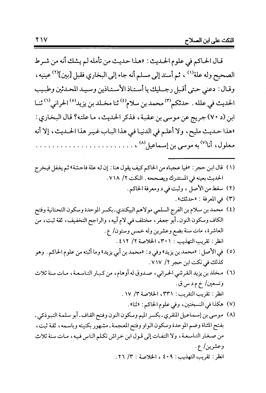 قَالَ الْحَاكِم فِي عُلُوم الحَدِيث هَذَا حَدِيث من تَأمله لم يشك أَنه من شَرط الصَّحِيح وَله عِلّة ثمَّ أسْند إِلَى مُسلم أَنه جَاءَ إِلَى البُخَارِيّ فَقبل [بَين] عَيْنَيْهِ وَقَالَ دَعْنِي حَتَّى أقبل رجليك يَا أستاذ الأستاذين وَسيد الْمُحدثين وطبيب الحَدِيث فِي علله حَدثكُمْ مُحَمَّد بن سَلام ثَنَا مخلد بن يزِيد الْحَرَّانِي ثَنَا ابْن (د 70) جريج عَن مُوسَى بن عقبَة فَذكر الحَدِيث مَا علته قَالَ البُخَارِيّ هَذَا حَدِيث مليح وَلَا أعلم فِي الدُّنْيَا فِي هَذَا الْبَاب غير هَذَا الحَدِيث إِلَّا أَنه مَعْلُول أَنا بِهِ مُوسَى بن إِسْمَاعِيل