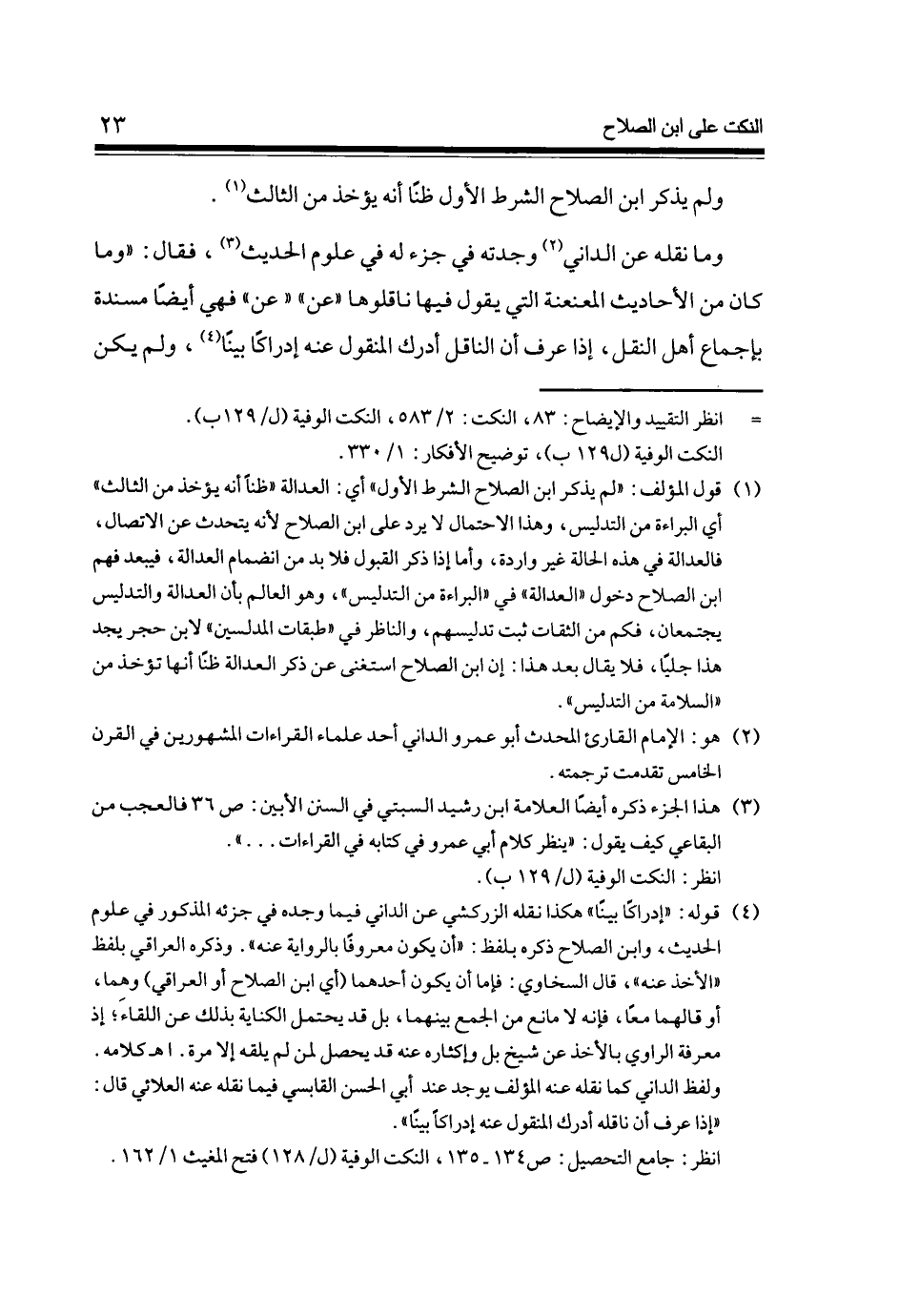 وَمَا نَقله عَن الداني وجدته فِي جُزْء لَهُ فِي عُلُوم الحَدِيث فَقَالَ وَمَا كَانَ من الْأَحَادِيث المعنعنة الَّتِي يَقُول فِيهَا ناقلوها عَن عَن فَهِيَ أَيْضا مُسندَة بِإِجْمَاع أهل النَّقْل إِذا عرف أَن النَّاقِل أدْرك الْمَنْقُول عَنهُ إدراكا بَينا وَلم يكن