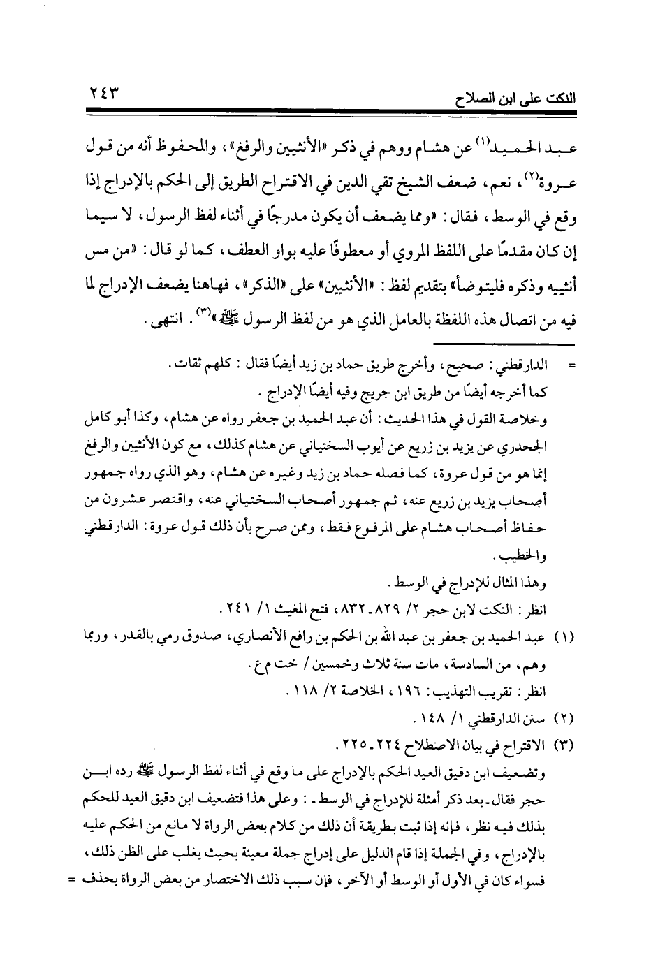 عبد الحميد عَن هِشَام وَوهم فِي ذكر الْأُنْثَيَيْنِ والرفغ وَالْمَحْفُوظ أَنه من قَول عُرْوَة نعم ضعف الشَّيْخ تَقِيّ الدّين فِي الاقتراح الطَّرِيق إِلَى الحكم بالإدراج إِذا وَقع فِي الْوسط فَقَالَ وَمِمَّا يضعف أَن يكون مدرجا فِي أثْنَاء لفظ الرَّسُول لَا سِيمَا إِن كَانَ مقدما على اللَّفْظ الْمَرْوِيّ أَو مَعْطُوفًا عَلَيْهِ بواو الْعَطف كَمَا لَو قَالَ من مس أنثييه وَذكره فَليَتَوَضَّأ بِتَقْدِيم لفظ الْأُنْثَيَيْنِ على الذّكر فها هُنَا يضعف الإدراج لما فِيهِ من اتِّصَال هَذِه اللَّفْظَة بالعامل الَّذِي هُوَ من لفظ الرَّسُول صلى الله عَلَيْهِ وَسلم انْتهى
