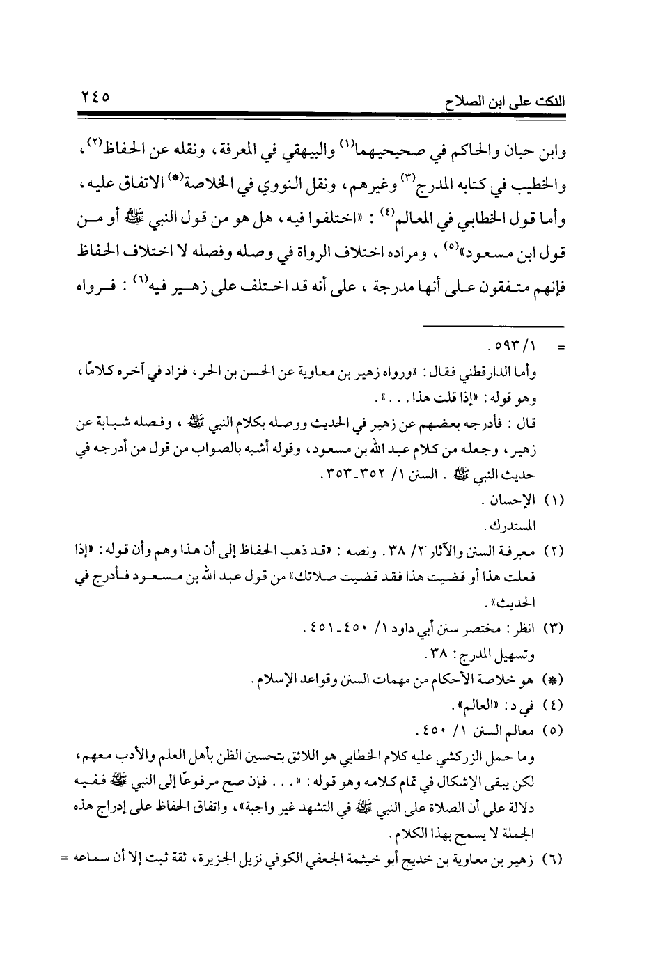 وَابْن حبَان وَالْحَاكِم فِي صَحِيحَيْهِمَا وَالْبَيْهَقِيّ فِي الْمعرفَة وَنَقله عَن الْحفاظ والخطيب فِي كِتَابه المدرج وَغَيرهم وَنقل النَّوَوِيّ فِي الْخُلَاصَة الِاتِّفَاق عَلَيْهِ وَأما قَول الْخطابِيّ فِي المعالم اخْتلفُوا فِيهِ هَل هُوَ من قَول النَّبِي صلى الله عَلَيْهِ وَسلم أَو من قَول ابْن مَسْعُود وَمرَاده اخْتِلَاف الروَاة فِي وَصله وفصله لَا اخْتِلَاف الْحفاظ فَإِنَّهُم متفقون على أَنَّهَا مدرجة على أَنه قد اخْتلف على زُهَيْر فِيهِ فَرَوَاهُ
