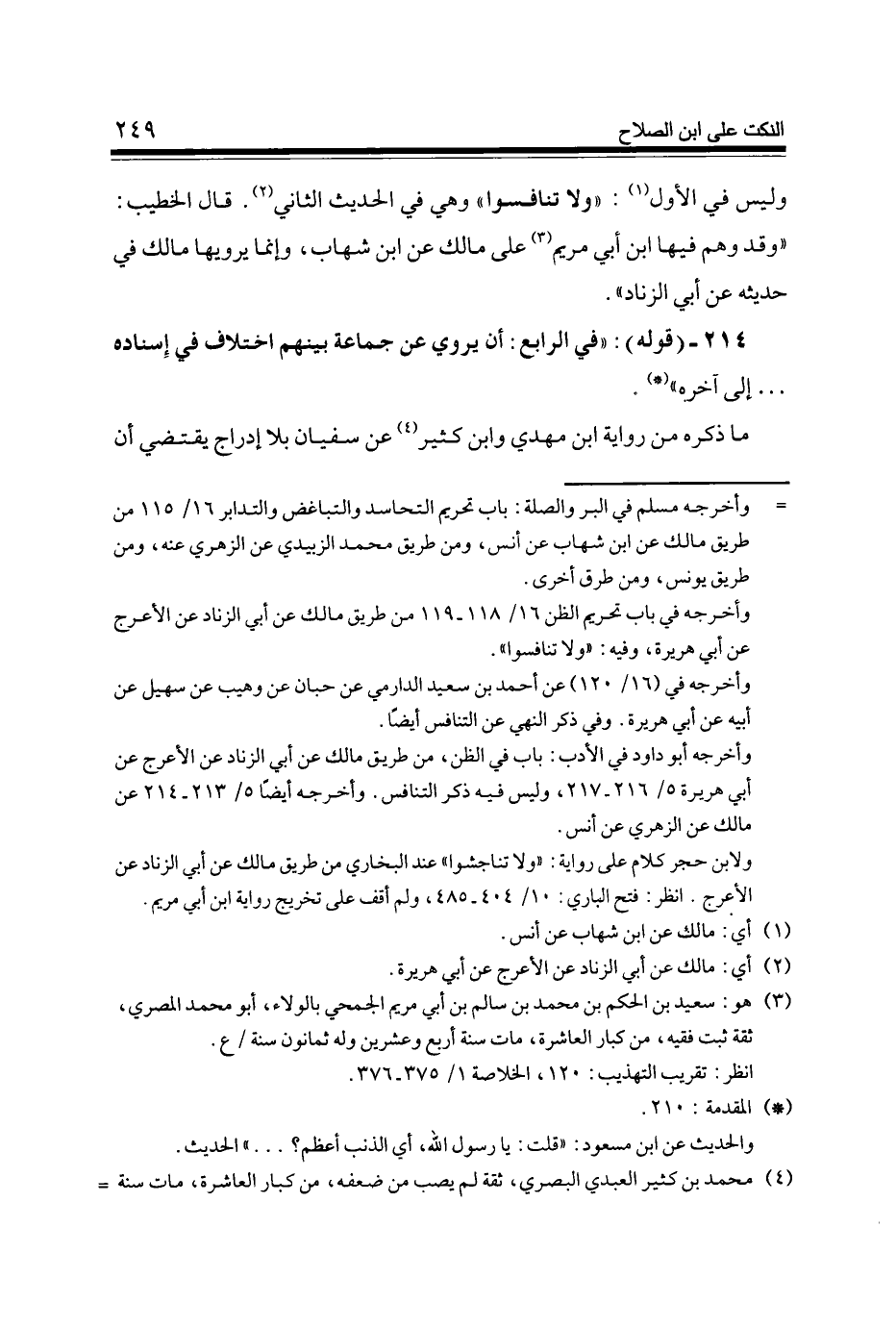 وَلَيْسَ فِي الأول وَلَا تنافسوا وَهِي فِي الحَدِيث الثَّانِي قَالَ الْخَطِيب وَقد وهم فِيهَا ابْن أبي مَرْيَم على مَالك عَن ابْن شهَاب وَإِنَّمَا يَرْوِيهَا مَالك فِي حَدِيثه عَن أبي الزِّنَاد