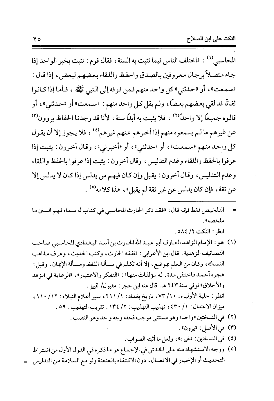 المحاسبي اخْتلف النَّاس فِيمَا تثبت بِهِ السّنة فَقَالَ قوم تثبت بِخَبَر الْوَاحِد إِذا جَاءَ مُتَّصِلا بِرِجَال معروفين بِالصّدقِ وَالْحِفْظ واللقاء بَعضهم لبَعض إِذا قَالَ سَمِعت أَو حَدثنِي كل وَاحِد مِنْهُم فَمن فَوْقه إِلَى النَّبِي صلى الله عَلَيْهِ وَسلم فَأَما إِذا كَانُوا ثقاتا قد لَقِي بَعضهم بَعْضًا وَلم يقل كل وَاحِد مِنْهُم سَمِعت أَو حَدثنِي أَو قَالُوهُ جَمِيعًا إِلَّا وَاحِدًا فَلَا يثبت بِهِ أبدا سنة لأَنا قد وجدنَا الْحفاظ يروون عَن غَيرهم مَا لم يسمعوه مِنْهُم إِذا أخْبرهُم عَنْهُم غَيرهم فَلَا يجوز إِلَّا أَن يَقُول كل وَاحِد مِنْهُم سَمِعت أَو حَدثنِي أَو أَخْبرنِي وَقَالَ آخَرُونَ يثبت إِذا عرفُوا بِالْحِفْظِ واللقاء وَعدم التَّدْلِيس وَقَالَ آخَرُونَ يثبت إِذا عرفُوا بِالْحِفْظِ واللقاء وَعدم التَّدْلِيس وَقَالَ آخَرُونَ يقبل وَإِن كَانَ فيهم من يُدَلس إِذا كَانَ لَا يُدَلس إِلَّا عَن ثِقَة فَإِن كَانَ يُدَلس عَن غير ثِقَة لم يقبل هَذَا كَلَامه