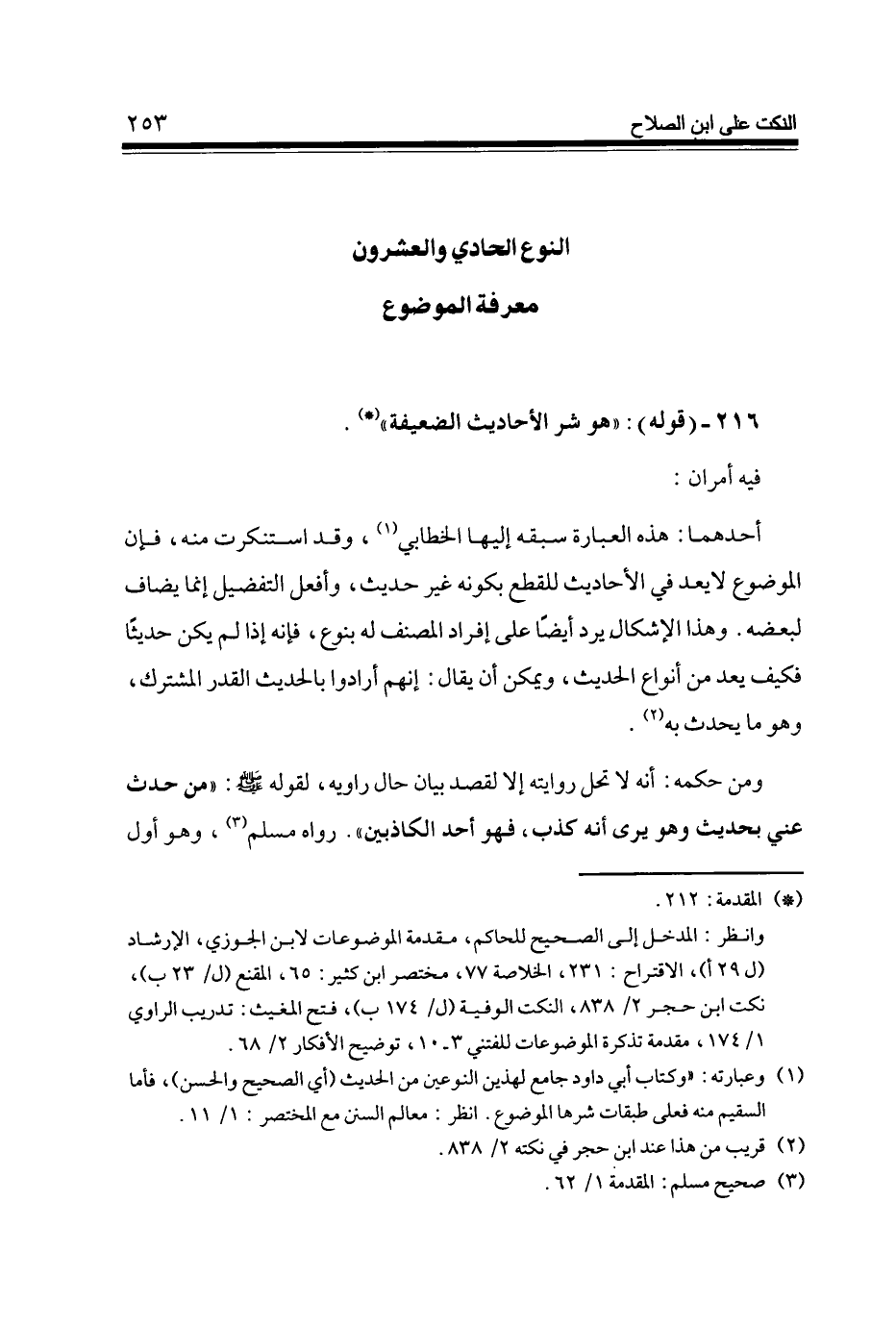 أَحدهمَا هَذِه الْعبارَة سبقه إِلَيْهَا الْخطابِيّ وَقد استنكرت مِنْهُ فَإِن الْمَوْضُوع لَا يعد فِي الْأَحَادِيث للْقطع بِكَوْنِهِ غير حَدِيث وأفعل التَّفْضِيل إِنَّمَا يُضَاف لبعضه وَهَذَا الْإِشْكَال يرد أَيْضا على إِفْرَاد المُصَنّف لَهُ بِنَوْع فَإِنَّهُ إِذا لم يكن حَدِيثا فَكيف يعد من أَنْوَاع الحَدِيث وَيُمكن أَن يُقَال إِنَّهُم أَرَادوا بِالْحَدِيثِ الْقدر الْمُشْتَرك وَهُوَ مَا يحدث بِهِ