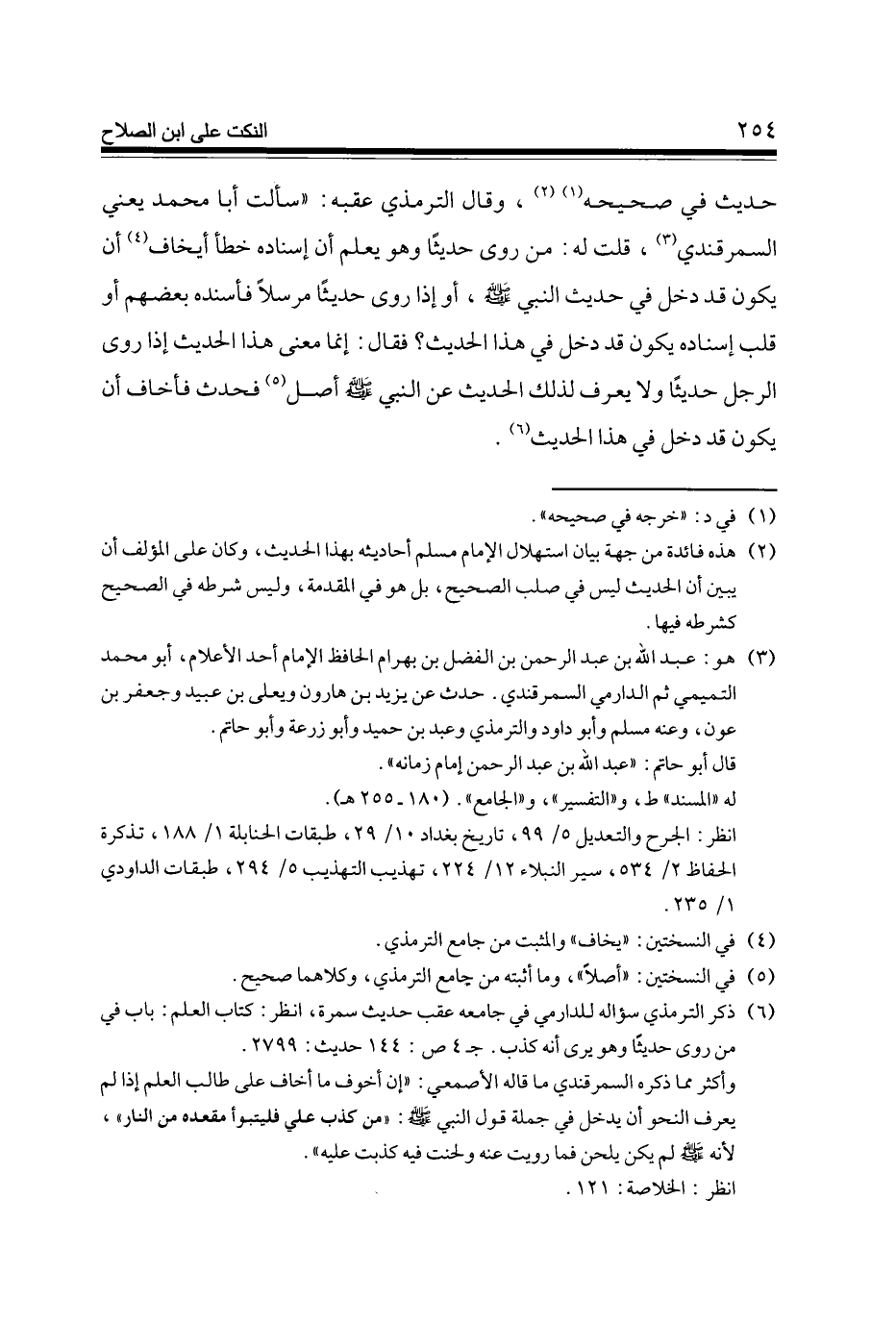 حَدِيث فِي صَحِيحه وَقَالَ التِّرْمِذِيّ عقبه سَأَلت أَبَا مُحَمَّد يَعْنِي السَّمرقَنْدِي قلت لَهُ من روى حَدِيثا وَهُوَ يعلم أَن إِسْنَاده خطأ أيخاف أَن يكون قد دخل فِي حَدِيث النَّبِي صلى الله عَلَيْهِ وَسلم أَو إِذا روى حَدِيثا مُرْسلا فأسنده بَعضهم أَو قلب إِسْنَاده يكون قد دخل فِي هَذَا الحَدِيث فَقَالَ إِنَّمَا معنى هَذَا الحَدِيث إِذا روى الرجل حَدِيثا وَلَا يعرف لذَلِك الحَدِيث عَن النَّبِي صلى الله عَلَيْهِ وَسلم أصل فَحدث فَأَخَاف أَن يكون قد دخل فِي هَذَا الحَدِيث