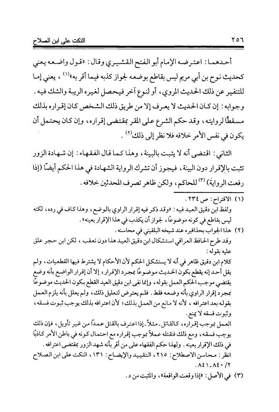 أَحدهمَا اعْتَرَضَهُ الإِمَام أَبُو الْفَتْح الْقشيرِي وَقَالَ قَول وَاضعه يَعْنِي كَحَدِيث نوح بن أبي مَرْيَم لَيْسَ بقاطع بِوَضْعِهِ لجَوَاز كذبه فِيمَا أقرّ بِهِ يَعْنِي إِمَّا للتنفير عَن ذَلِك الحَدِيث الْمَرْوِيّ أَو لنَوْع آخر فَيحصل لغيره الرِّيبَة وَالشَّكّ فِيهِ وَجَوَابه إِن كَانَ الحَدِيث لَا يعرف إِلَّا من طَرِيق ذَلِك الشَّخْص كَانَ إِقْرَاره بذلك مسْقطًا لروايته وَقد حكم الشَّرْع على الْمقر بِمُقْتَضى إِقْرَاره وَإِن كَانَ يحْتَمل أَن يكون فِي نفس الْأَمر خِلَافه فَلَا نظر إِلَى ذَلِك