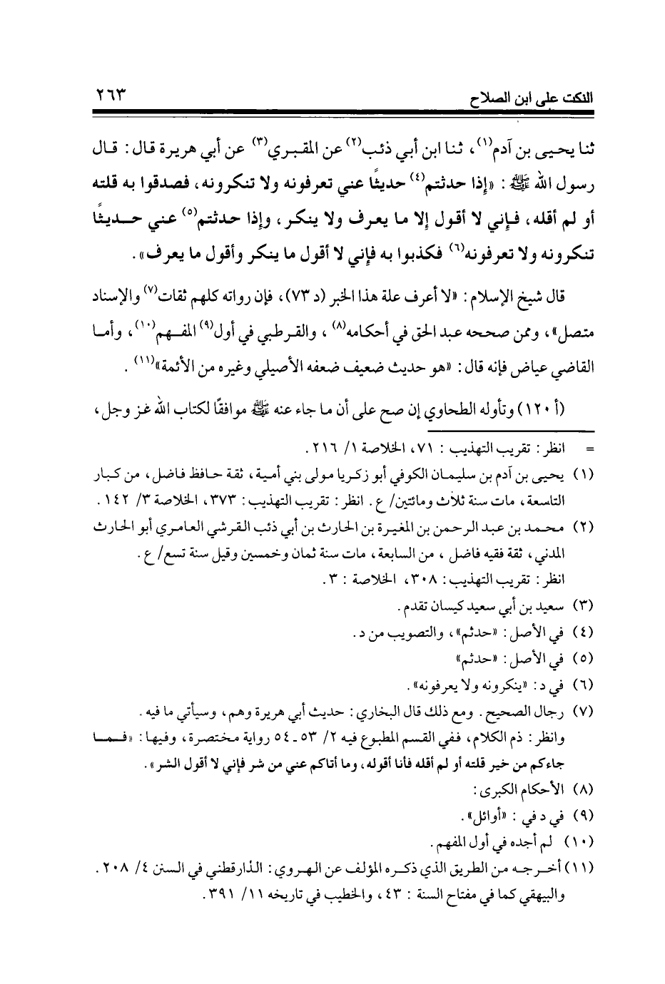 قَالَ شيخ الْإِسْلَام لَا أعرف عِلّة هَذَا الْخَبَر (د 73) فَإِن رُوَاته كلهم ثِقَات والإسناد مُتَّصِل وَمِمَّنْ صَححهُ عبد الْحق فِي أَحْكَامه والقرطبي فِي أول الْمُفْهم وَأما القَاضِي عِيَاض فَإِنَّهُ قَالَ هُوَ حَدِيث ضَعِيف ضعفه الْأصيلِيّ وَغَيره من الْأَئِمَّة
