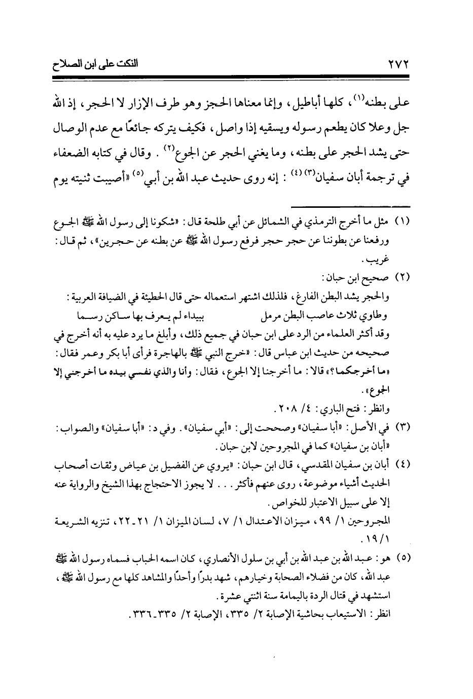 على بَطْنه كلهَا أباطيل وَإِنَّمَا مَعْنَاهَا الحجز وَهُوَ طرف الْإِزَار لَا الْحجر إِذْ الله جلّ وَعلا كَانَ يطعم رَسُوله ويسقيه إِذا وَاصل فَكيف يتْركهُ جائعا مَعَ عدم الْوِصَال حَتَّى يشد الْحجر على بَطْنه وَمَا يُغني الْحجر عَن الْجُوع وَقَالَ فِي كِتَابه الضُّعَفَاء فِي تَرْجَمَة أبان سُفْيَان إِنَّه روى حَدِيث عبد الله بن أبي أُصِيبَت ثنيته يَوْم